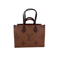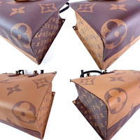 Pre-Owned 100% Authentic Louis Vuitton ONTHEGO MM Reverse Giant Monogram Tote RATING: B...very good, well maintained, shows minor signs of wear MATERIAL: monogram Giant Reverse coated canvas HANDLES: canvas Drop: 5'' STRAPS: brown and tan canvas, not removable Drop: 12'' COLOR: brown, beige, black, tan EXTERIOR: very good ODOR: no HARDWARE: shiny golden INTERIOR: red textile lining, has 2 small stains on bottom , tiny bit of black mark near the top both sides DATE CODE: FP3270 Made in Italy MEASUREMENTS: H 10 x L 13.5'' x W 6'' INCLUDED: *felt insert to help organize and structured Please see all pictures to determine final condition, they are of actual item ! SKU A1365 0825