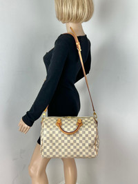Pre-Owned 100% Authentic Louis Vuitton damier Azur Speedy Bandouliere 30 RATING: B...very good, well maintained, shows minor signs of wear MATERIAL: damier azur, leather trim LEATHER TRIM: has some light marks and stains HANDLE: double leather, has some light marks and stains DROP: 3.5'' STRAP: LV Leather Removable Adjustable Strap 28'' to 48'' long, comes with 3 pieces(1 can be taken out to make real short) about a 2'' section that looks like some light doggy bites(see pict) DROP : 10.5'' to 20.5'' COLOR: white, blue EXTERIOR: 4 corners show little sign of wear ODOR: no HARDWARE: golden, some wear & scratches INTERIOR: has few tiny roundish stains, couple faint marks, clean DATE CODE: SP4115 MEASUREMENTS: H 9'' x L 12'' x W 7'' INCLUDED: *LV Dust bag*LV Leather Removable Adjustable Strap 28'' to 48'' long)includes 3 piece leather straps *LV Lock #305*2 LV Keys #305 *New Non LV Red Felt Insert 13''Lx7''Hx9''W SHOPPING: Please see my other items at Debsluxurycloset SHIPPING: will ship same day or next day using USPS Priority Mail or Fedex Please see all pictures to determine final condition, they are of actual item ! SKU A997 0722-D
