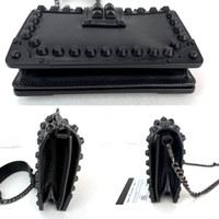 Pre-Owned 100% Authentic Prada City Calfskin Saffiano Studded Cahier Crossbody Clutch Bag Black RATING: A.. excellent, near mint, has little to no signs of wear MATERIAL: calfskin, black studs STRAP: prada removable black chain and leather shoulder strap with studs 44'' long DROP: 21'' COLOR: black CLOSURE: pull through tab, has a line indent under piece that goes under bar(see pict) EXTERIOR: excellent ODOR: no HARDWARE: black INTERIOR: black leather, mint DATE CODE: 25 MEASUREMENTS: H 5'' x L 7'' x W 1.5'' INCLUDED: *Prada dust bag*Prada Authenticity Card Please see all pictures to determine final condition, pictures are of actual item ! SHIPPING: will ship same day or next day SKU C483 0225-D