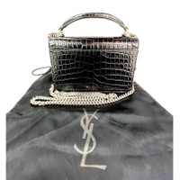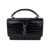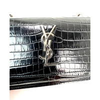 Pre-Owned 100% Authentic Saint Laurent Black Leather Sunset Wallet on a Chain Crocodile Pattern Embossed Bag RATING: A/B...Very Good, well maintained, shows minor signs of wear MATERIAL: calfskin leather STRAP: sliding silver with leather shoulder pad DROP: single 23'' double 12'' COLOR: black CLOSURE: magnetic EXTERIOR: crocodile pattern on leather, back pocket ODOR: no HARDWARE: silver, minimal scratches INTERIOR: black leather, 8 Credit card slots, zippered coin section, 1 open section, 1 open pocket with open pocket attached to front, front flap has some faint scuff lines and bend line from opening DATE CODE: BRS 452157 1016 MEASUREMENTS: H 4.7'' x L 6.6'' x W 1.5'' INCLUDED: *YSL dust bag Please see all pictures to determine final condition, pictures are of actual item ! SHIPPING: will ship same day or next day SKU B778 0525