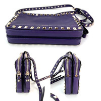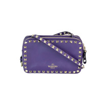 Pre-Owned 100% Authentic Valentino Rockstud Double Zip Purple Leather Crossbody Bag RATING: B...Very Good, well maintained, shows minor signs of wear MATERIAL: leather STRAP: adjustable purple leather studded strap (tuck in middle to hid and use as a Clutch) DROP: adjustable 22'' to 24'' COLOR: purple CLOSURE: zipper EXTERIOR: faint line indents on back ODOR: no HARDWARE: antique gold, some scratches INTERIOR: beige canvas in both sections, clean DATE CODE: TV JW2B0564BO1 MEASUREMENTS: H 5'' x L 7.5'' x W 1.7'' INCLUDED: *Valentino dust bag Please see all pictures to determine final condition, pictures are of actual item ! SHIPPING: will ship same day or next day SKU C432 1024