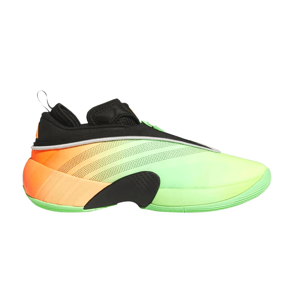 The adidas D.O.N. Issue #7 'Lime Burst Screaming Orange' showcases tropical hues on a textile upper, highlighted by a gradient blend of orange and lime green. Contrasting black accents land on the interior sleeve and zippered shroud. Donovan Mitchell's spider logo graces the tongue, while adidas' three-bar trademark decorates the heel tab. Mirroring the upper, a gradient design covers the full-length Lightstrike midsole. A prominent midfoot shank offers torsional rigidity and energy return. UPPER MATERIAL Synthetic