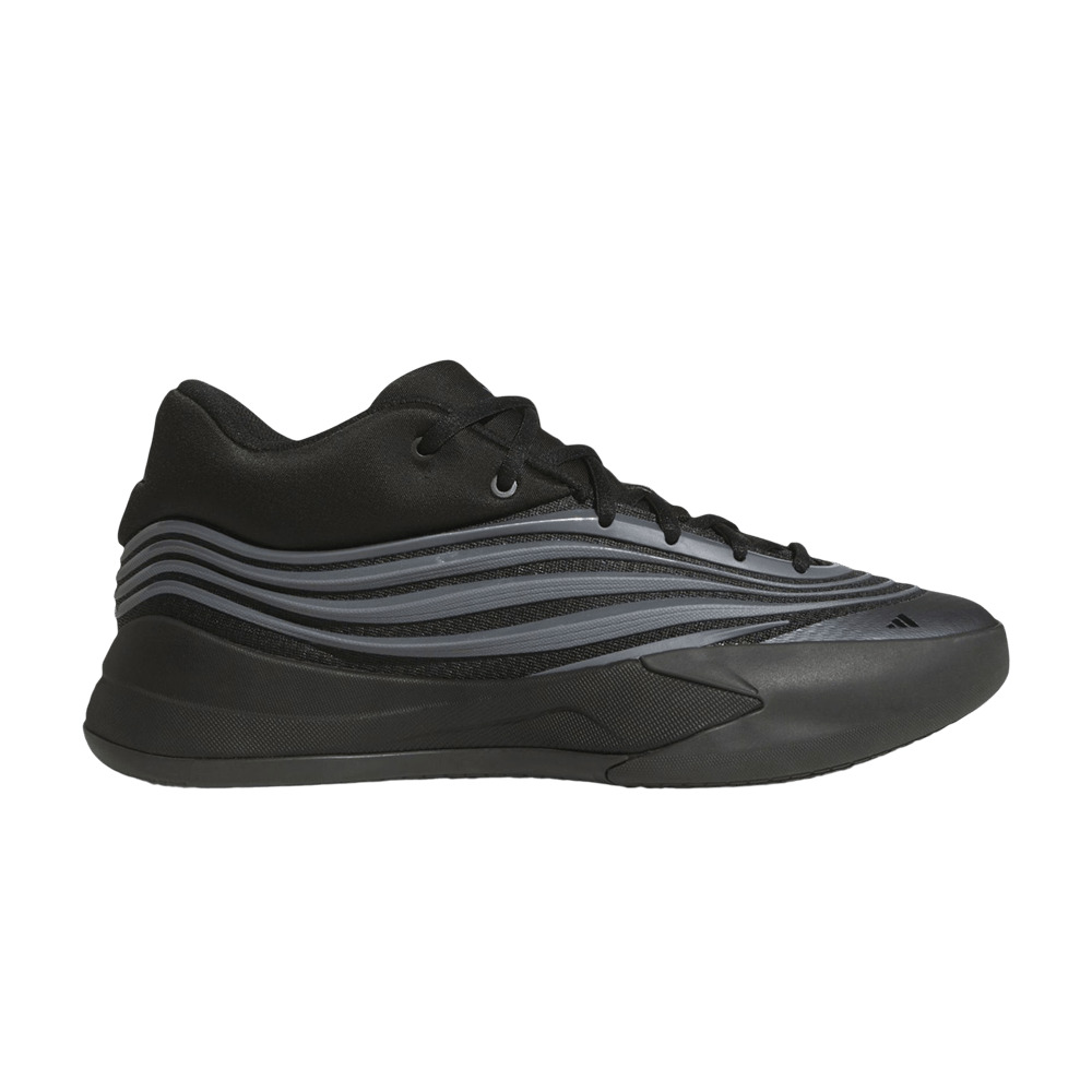 The adidas Dame X 'Black Iron Metallic' presents one of the launch colorways of Damian Lillard's tenth signature shoe. Wavy TPU overlays in grey encircle the blacked-out upper, crafted from a combination of breathable mesh and padded textile. Lillard's personal logo adorns the tongue in royal blue, matching the adidas branding hit that decorates the heel tab. The sneaker is mounted on a matching black Lightstrike midsole. UPPER MATERIAL Synthetic