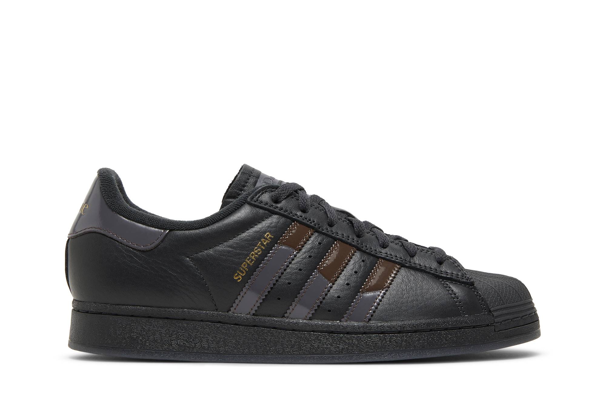 Taken from a collaborative capsule collection, the Dime x adidas Superstar ADV ‘Carbon Brown’ updates the classic silhouette with a stealthy finish. The upper is crafted from black full-grain leather with the iconic rubber shell toe in a matching black finish. In addition to the shoe’s signature three-stripes, two-tone patent leather is utilized on each heel tab, featuring mismatched adidas and Dime branding. A black rubber midsole is supported by a translucent herringbone-traction outsole, which reveals an oversized Dime logo in metallic gold lettering. UPPER MATERIAL Leather