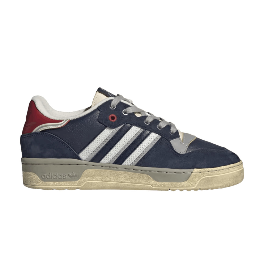 Launching as part of adidas Consortium’s ‘Rivalry Series,’ the Extra Butter x adidas Rivalry Low ‘Navy’ dresses the low-top in a navy leather upper, fortified with tonal suede overlays at the forefoot and heel. White mesh three-stripes, accented with exposed zigzag stitching and grey trim, decorate the quarter panel, while a contrasting burst of crimson appears on the leather back tab. The sneaker sits on a two-tone rubber midsole, featuring stitched sidewall construction and a pre-distressed finish. UPPER MATERIAL Leather