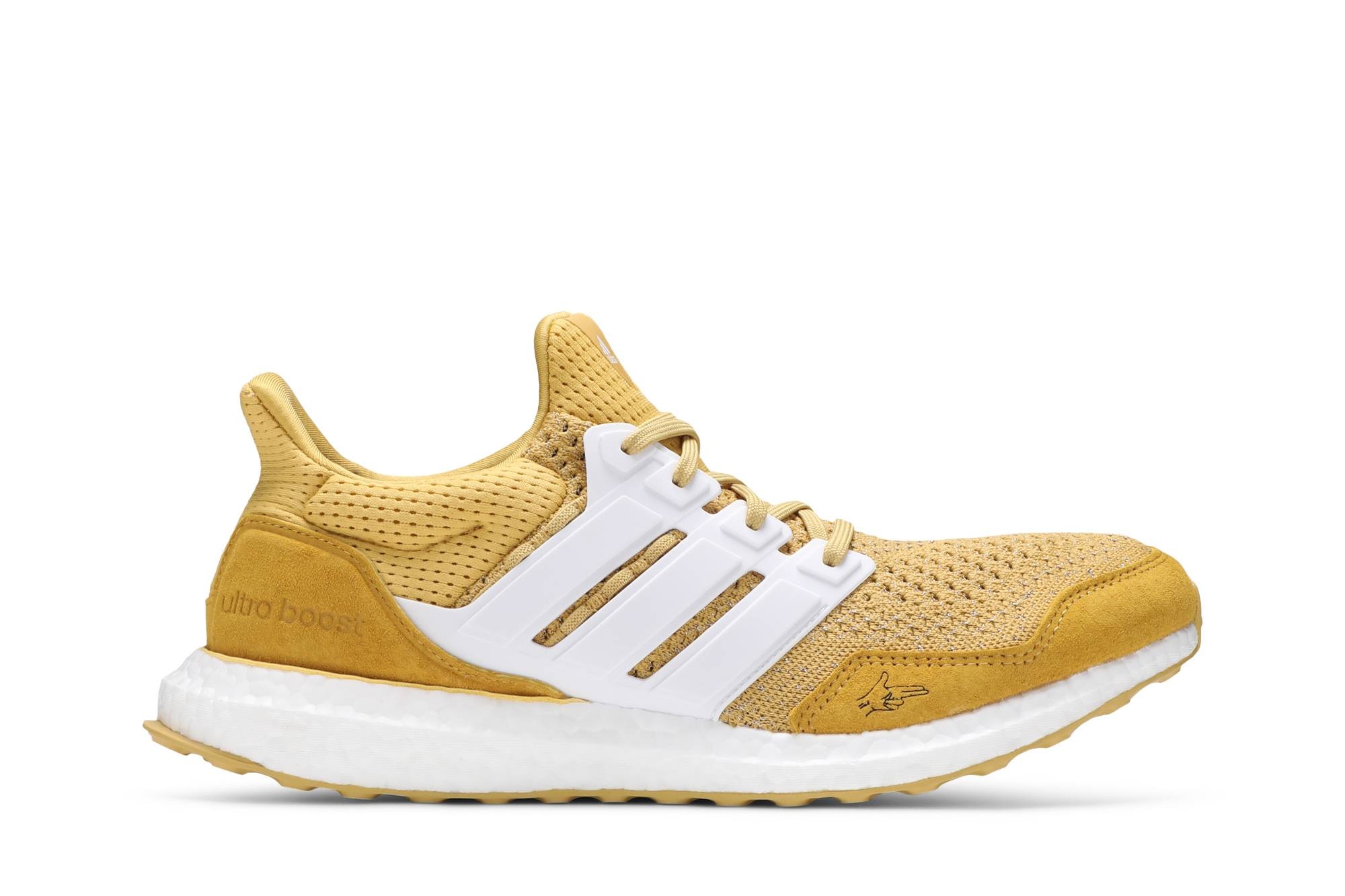 The Happy Gilmore x Extra Butter x adidas UltraBoost 1.0 ‘Gold Jacket’ celebrates the 25th anniversary of Adam Sandler’s hit comedy film, centered around a failed hockey player turned professional golfer. The New York-based retailer dresses the lifestyle runner in yellow Primeknit — a nod to the coveted gold jacket awarded to Happy after he beats Shooter McGavin at the Tour Championship. The upper is reinforced with a white midfoot cage and tonal suede overlays at the heel and forefoot, the latter imprinted with a graphic depicting Shooter’s signature finger-gun gesture. Dual Extra Butter and adidas branding adorns the sockliner. UPPER MATERIAL Primeknit