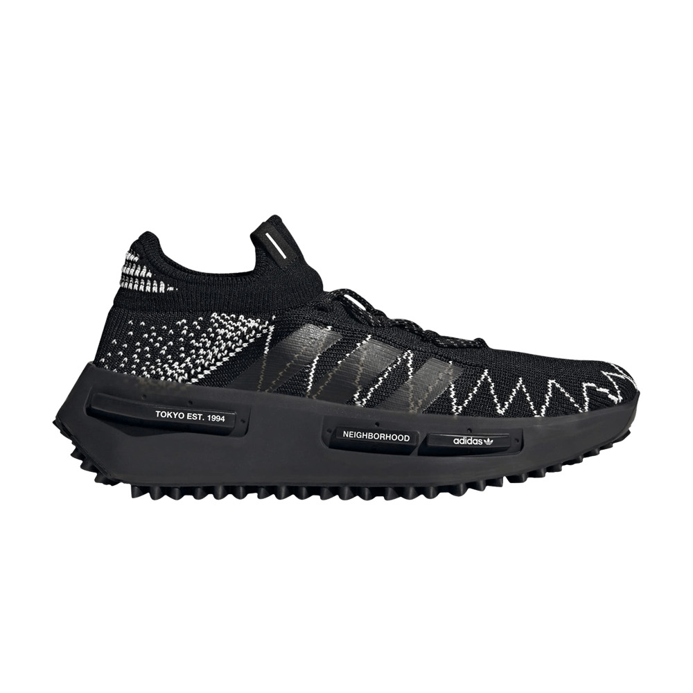 The Neighborhood x adidas NMD_S1 'Black' reunites the partner brands on a stealthy colorway of the lifestyle running shoe. Reflective rope laces secure the flexible black knit upper, featuring contrast white zigzag stitching and translucent TPU three-stripes. The sock-like build is mounted on a caged Boost midsole. Embedded in the lateral sidewall, TPU plugs display dual adidas and Neighborhood branding. A lugged rubber outsole provides durable traction underfoot. UPPER MATERIAL Primeknit