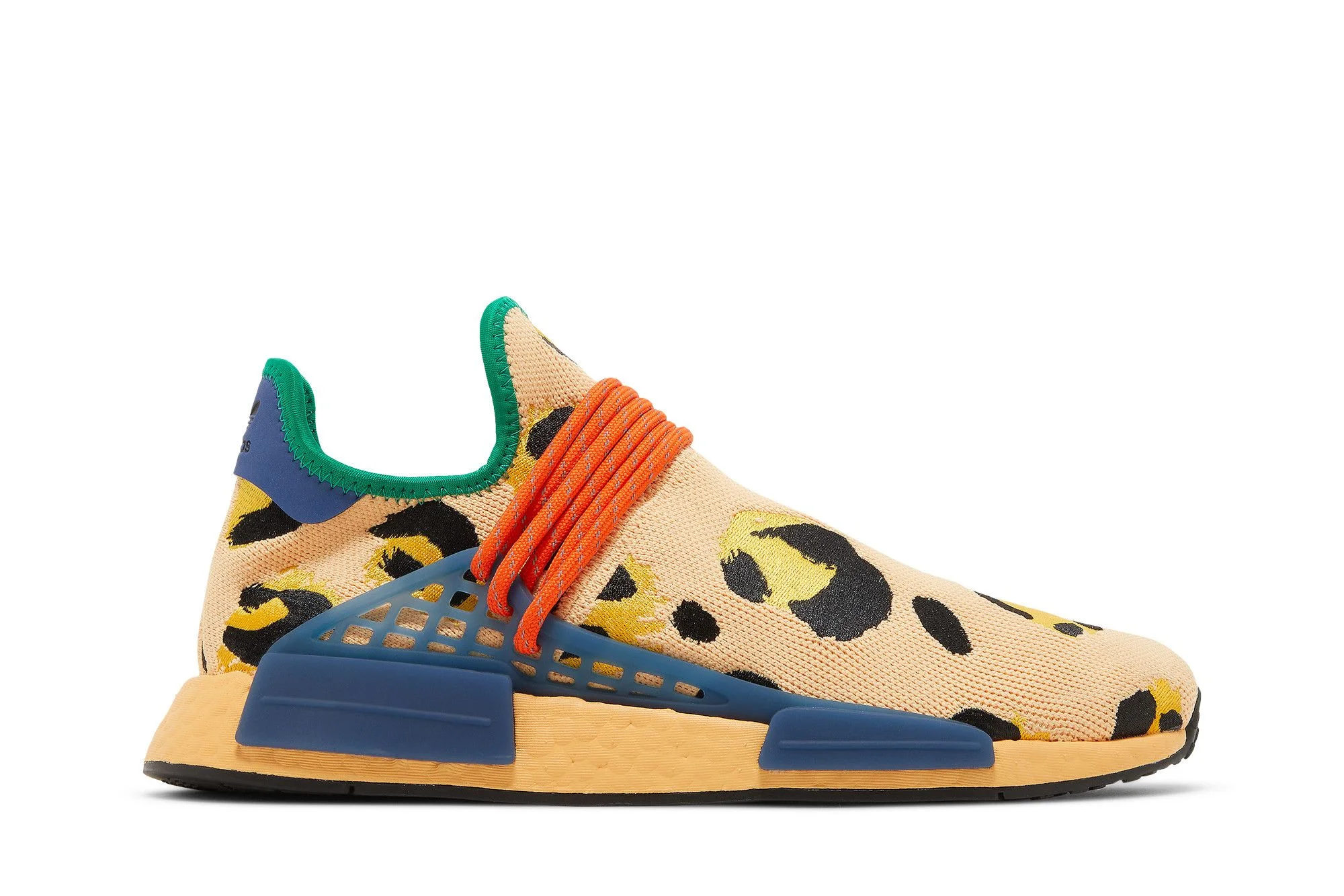 The Pharrell x adidas NMD Human Race ‘Pulse Amber’ dresses the minimalist silhouette in a colorful design inspired by the natural world. An oversized cheetah print decorates a light coral Primeknit upper with a low-cut collar trimmed in green binding. Red rope laces wrap over the midfoot and feed through a blue-tinged midfoot cage in semi-translucent TPU. Exterior branding is limited to the heel tab, featuring an adidas Trefoil on the right shoe and Pharrell’s equal-sign logo on the left. Responsive cushioning arrives via an orange-hued Boost midsole with TPU plugs that maintain the classic NMD aesthetic. UPPER MATERIAL Primeknit