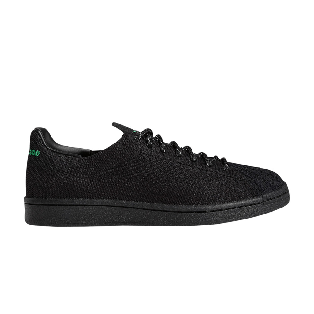 The Pharrell x adidas Superstar Primeknit ‘Black’ delivers the visionary creative’s interpretation of the classic silhouette. Traditional leather construction is replaced by flexible Primeknit, complete with woven detailing that replicates the look of the iconic shell toe. The all-black finish is disrupted by Vivid Green branding hits, including ‘Humanrace’ embroidered on the heel tab and an inverted adidas wordmark on the tongue. The lightweight build is mounted on a matching black rubber cupsole. UPPER MATERIAL Primeknit