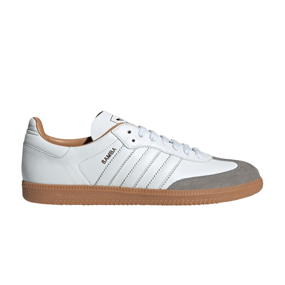 The adidas Samba Made in Italy 'White Gum' takes design inspiration from Italian dress shoes, featuring a crisp white leather upper with a contrasting forefoot overlay in grey suede. Details include tonal serrated three-stripes, a tan leather lining, and 'SAMBA' stamped in gold foil lettering on the lateral side. Anchoring the sneaker is a low-profile cupsole in durable gum rubber. UPPER MATERIAL Leather