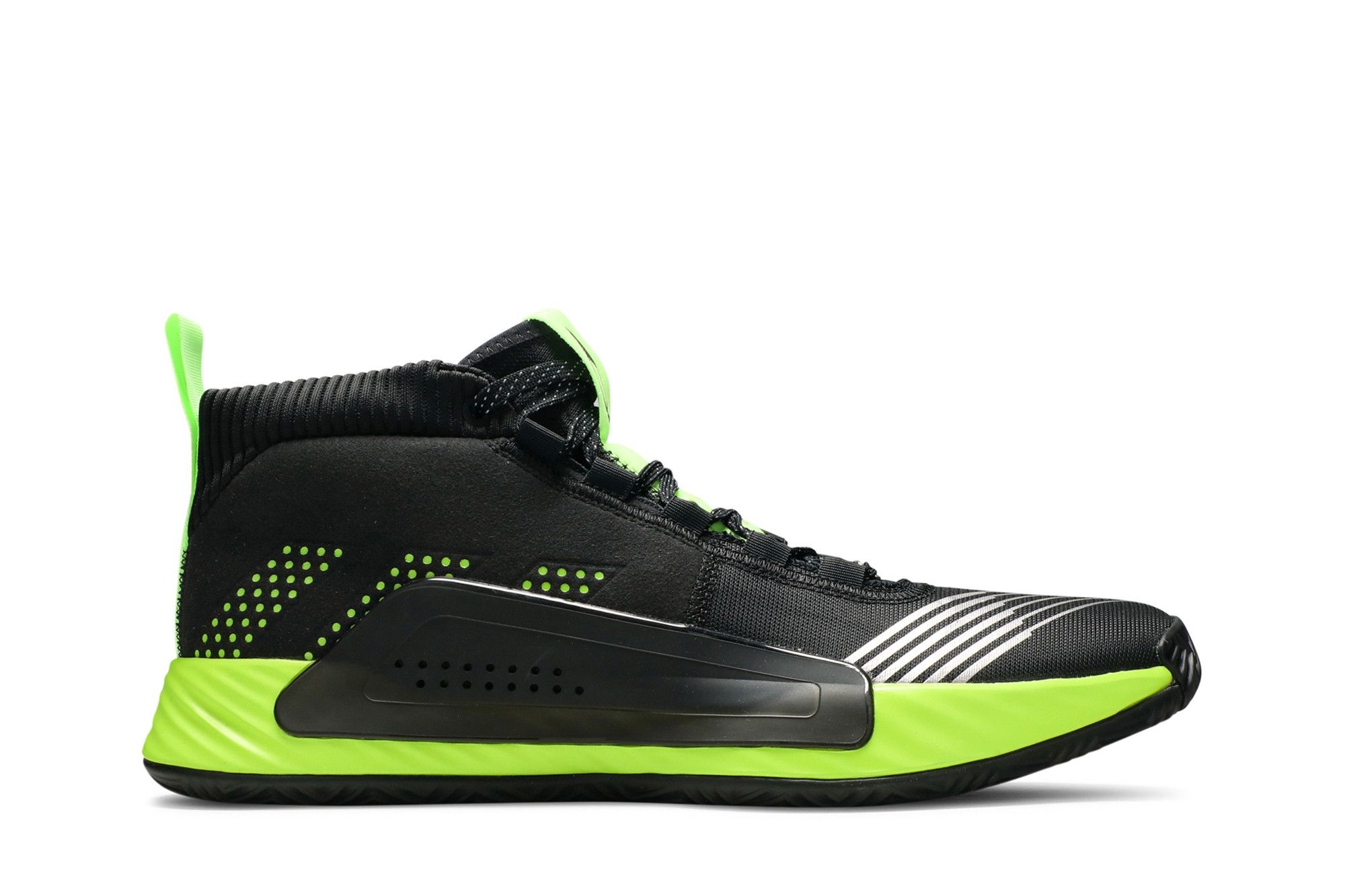 The Star Wars x adidas Dame 5 'Lightsaber' debuted in November 2019 ahead of the theatrical release of the franchise's ninth episode, The Rise of Skywalker. The sneaker salutes the iconic energy sword in black neoprene and mesh with stripes across the toe, neon Three-Stripes perforation and graphic lining. 3M reflectivity updates the laces. The Bounce midsole with a TPU midfoot overlay and herringbone rubber outsole return for flexible support.