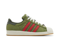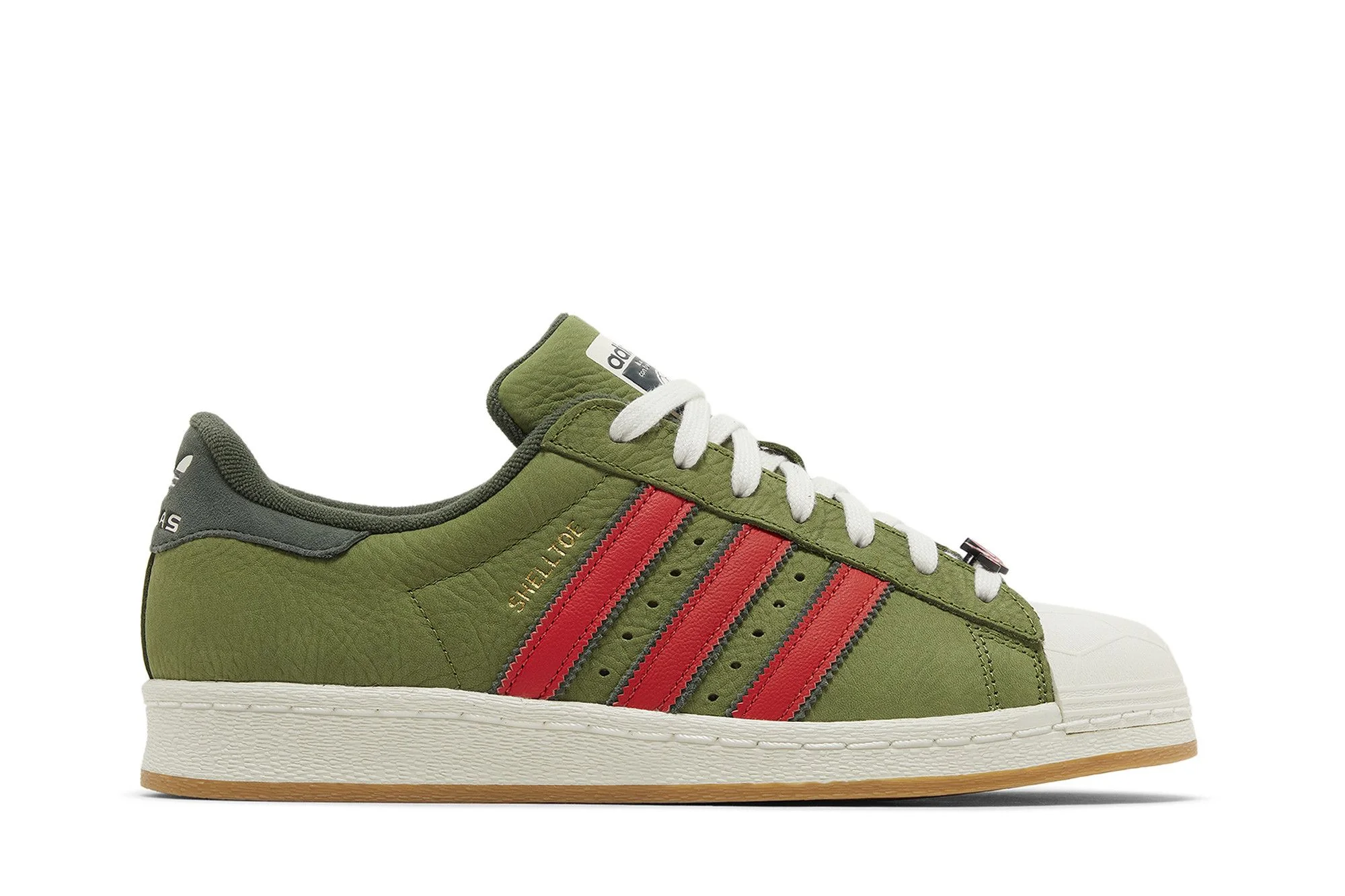 The Teenage Mutant Ninja Turtles x adidas Superstar 'Shelltoe' celebrates the 40th anniversary of the TMNT franchise. The low-top sports a green tumbled leather upper with contrasting scarlet three-stripes. 'SHELLTOE' is imprinted in gold foil lettering on the lateral side, while the white rubber toe features a turtle-shell design in a literal nod to the superhero reptiles. Additional flourishes include pizza-graphic insoles and lace jewels modeled after Raphael's signature red mask. Underfoot, a gum rubber outsole provides grippy traction. UPPER MATERIAL Leather