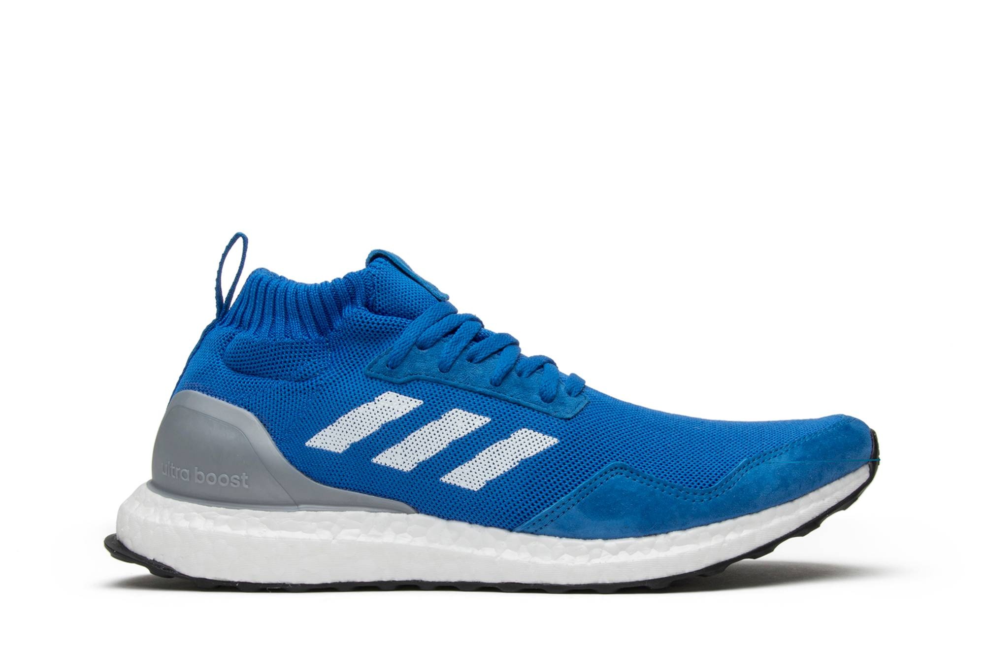 Released in July of 2017, this Ultra Boost Mid 'Run Thru Time' sneaker references classic silhouettes from the 1980s like the Boston Super and Marathon TR. The sneaker features a retro blue Primeknit upper, white three-stripes, suede overlays around the toe, and a hole-punched consortium tongue. The silver heel cup tops off the shoe's nod to its retro inspiration. UPPER MATERIAL Primeknit