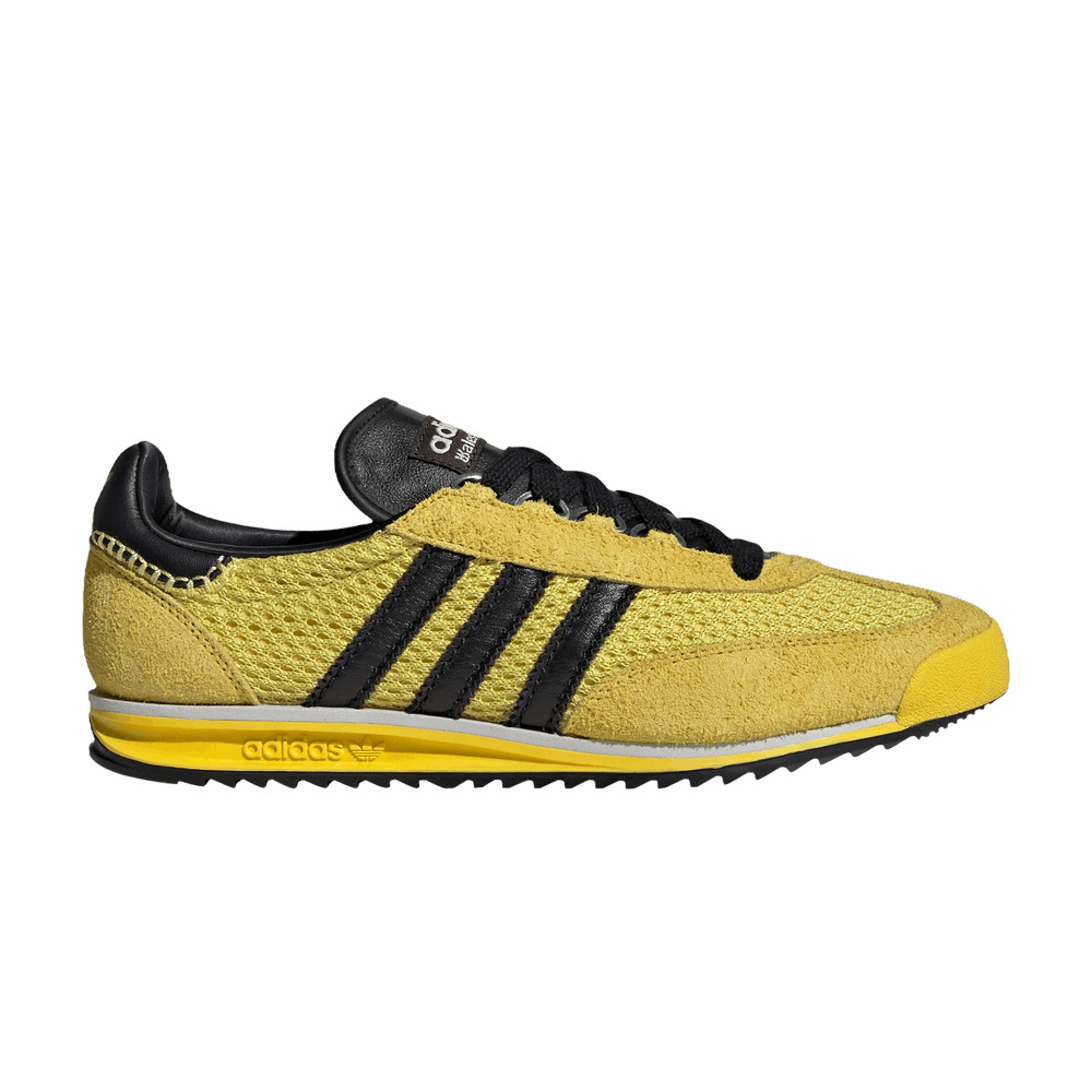 Dropping as part of a collaborative capsule collection, the Wales Bonner x adidas SL 76 'Yellow' is crafted from yellow mesh with tonal suede overlays at the forefoot and heel. Contrasting black leather accents settle on the serrated three-stripes, collar lining and back tab, outlined in deco stitching and stamped with a gold Trefoil. Dual adidas and Wales Bonner branding appears on the woven tongue tag. Lightweight cushioning arrives via an EVA midsole, painted yellow and supported by a black rubber outsole. UPPER MATERIAL Suede