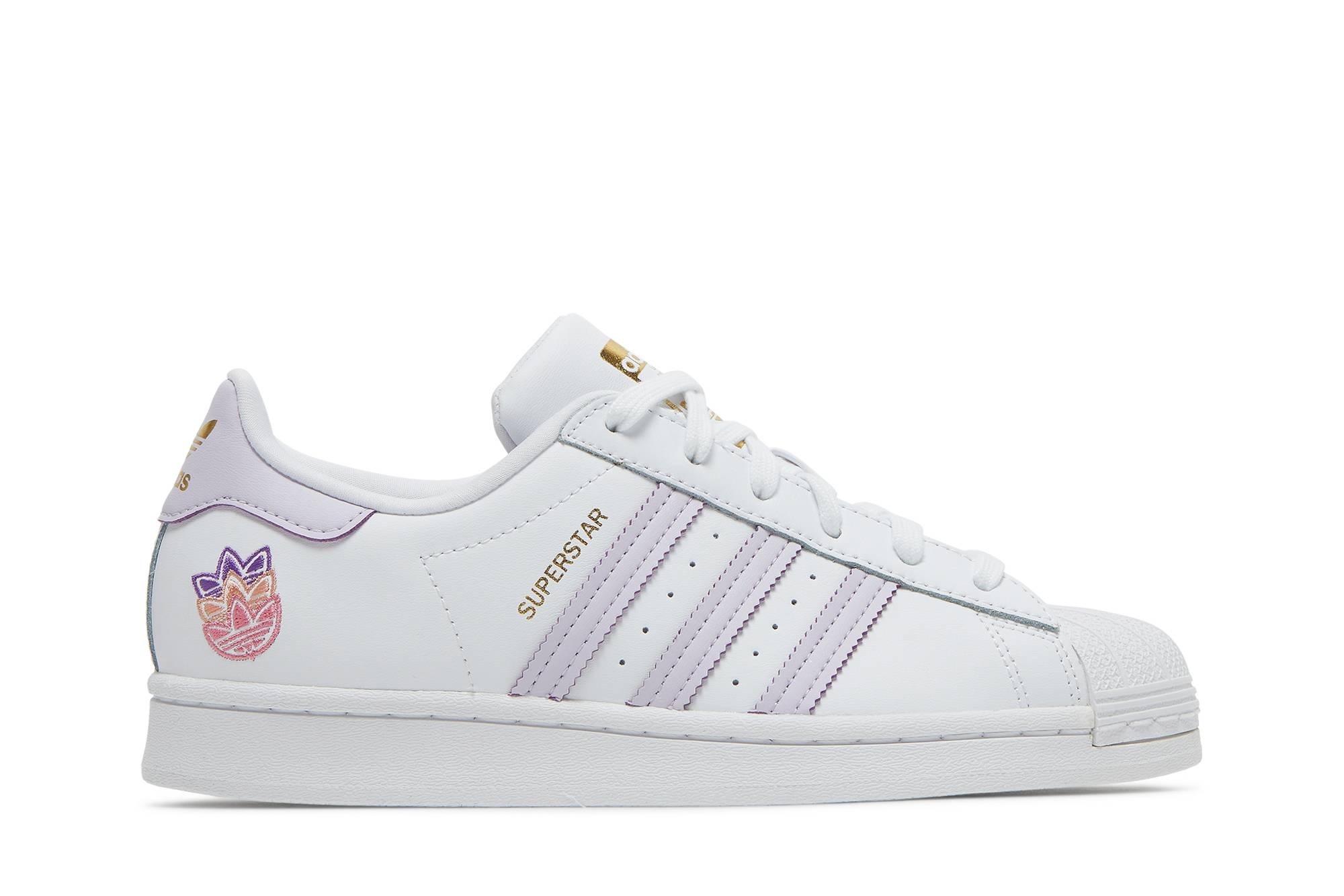 The adidas women’s Superstar ‘White Purple Tint’ updates the shell-toed sneaker icon with recycled content incorporated into the upper, crafted from white leather with a soft textile lining. Pastel lavender accents land on the serrated three-stripes and heel tab, marked with gold foil adidas branding. Atop the lateral heel, an embroidered multicolor graphic takes the form of three stacked Trefoil logos. The low-profile silhouette sits on a sturdy rubber cupsole with a traditional herringbone traction pattern underfoot. UPPER MATERIAL Leather