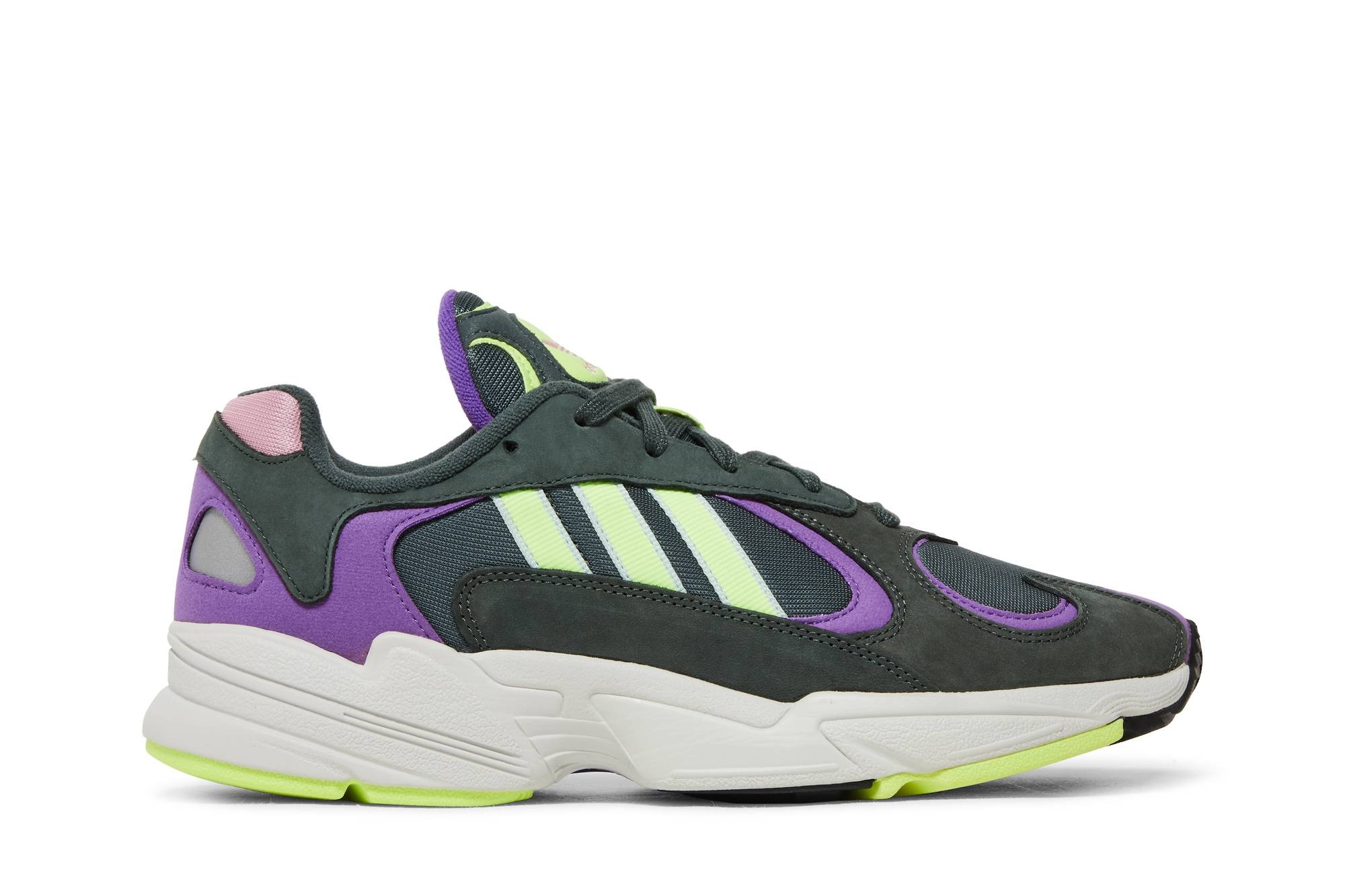 The adidas Yung-1 ‘Legend Ivy’ blends contrasting accents on its layered upper, built with a breathable mesh base in dark grey. Matching nubuck overlays are offset by purple leather detailing and fluorescent yellow Three-Stripes. A sculpted EVA foam midsole is supported underfoot by a high-traction rubber outsole, featuring adidas’ Torsion system for added stability.