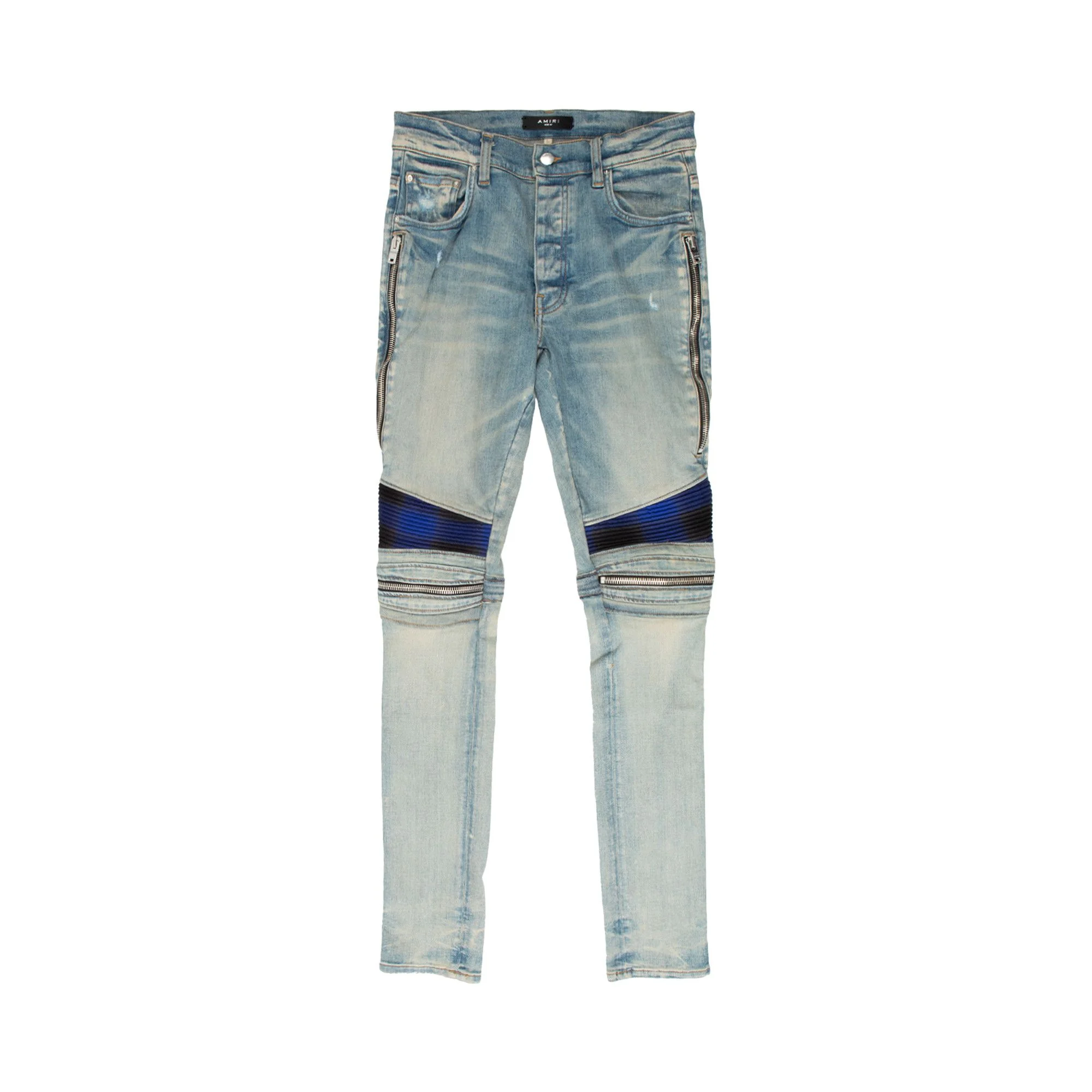 These Amiri Plaid MX2 jeans were created for the Resort 2022 season. Executed with a light blue wash, the skinny-leg pair features distressed detailing with inset plaid panels.