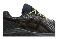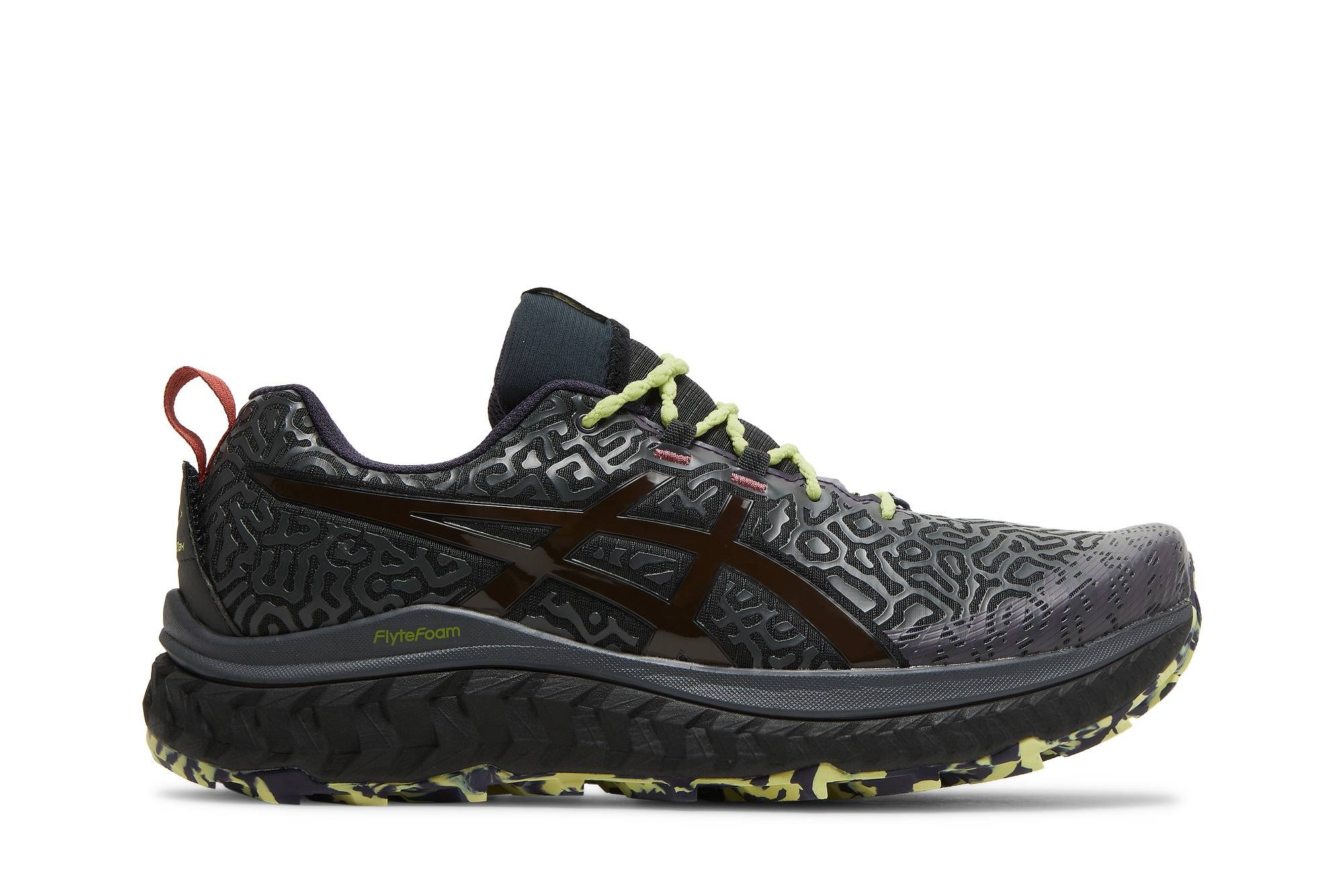 Crafted in partnership with LA-based creative collective, the Brain Dead x ASICS Trabuco Max ‘Chaos Slime’ gives the trail running shoe an eye-catching makeover. A maze-like 3D-printed overlay covers the black ripstop textile upper, accented with glossy tiger stripes and secured with knobby rope laces in a neon green hue. Brain Dead branding decorates the tongue tag, while ‘Trabuco Max’ is stamped on the heel tab. The sneaker is mounted on a plush FLYTEFOAM midsole, supported underfoot by a marbled ASICSGRIP rubber outsole studded with outdoor lugs. UPPER MATERIAL Mesh
