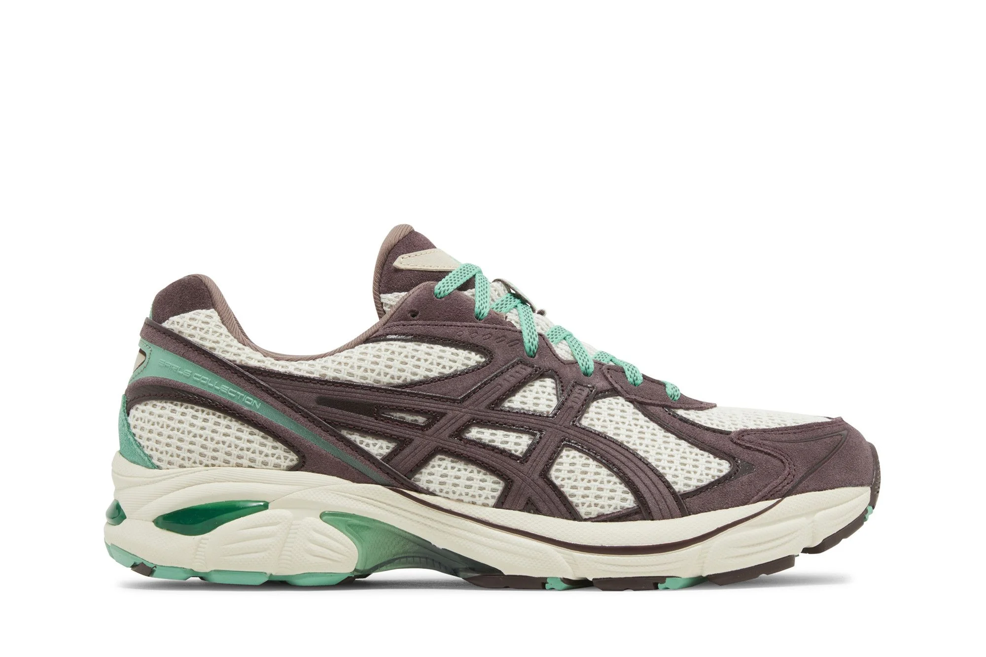 The Earls Collection x ASICS GT-2160 'Ngāwari' takes inspiration from the lineage of Lewis Brown, the founder of the luxury sportswear label. Māori cultural touchstones, including woven flax and pounamu — a green-hued stone found in Southern New Zealand — are reflected in the design of the lifestyle running shoe. Built with natural cotton mesh, the upper is fortified with brown suede overlays and accented with lush green detailing along the heel. Dual branding appears on custom sockliners, featuring a graphic print that nods to paua, a species of large edible sea snail. The sneaker rides on a cream-colored EVA midsole with emerald GEL inserts in the heel. UPPER MATERIAL Suede