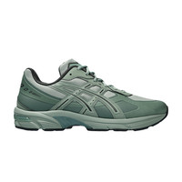 The ASICS GEL 1130 NS 'Slate Grey Graphite Grey' delivers a monochromatic green finish on the upper, built with a blend of ripstop textile and no-sew synthetic overlays. Grey lines trace the signature side stripes, while ASICS branding appears on the tongue and sockliner. Lightweight cushioning arrives via a foam midsole with shock-absorbing GEL inserts in the heel.