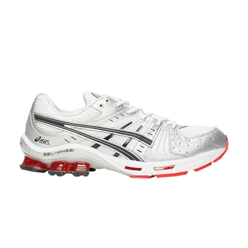 An exploration of protected yet fluid motion, the ASICS Gel Kinsei OG is a technical running sneaker designed by Hisanori Fujita inspired by samurai armor. This modern rendition—issued in September 2019—has an anatomical mesh upper overlaid by silver leather and contrast logo stripes. Its heel echoes the angle of katana swords. The sneaker's Gel-assisted midsole and high-abrasion rubber outsole boast Impact Guidance and Trusstic Systems for flexible structure.