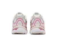 The ASICS Gel NYC 'Cream Pink' combines mesh upper with pink synthetic suede overlays. Branding elements include silver side stripes outlined in a light pink hue and ASICS' spiral logo embroidered on the tongue. A two-tone EVA foam midsole, fitted with visible Gel inserts in the forefoot and heel, provides lightweight cushioning.