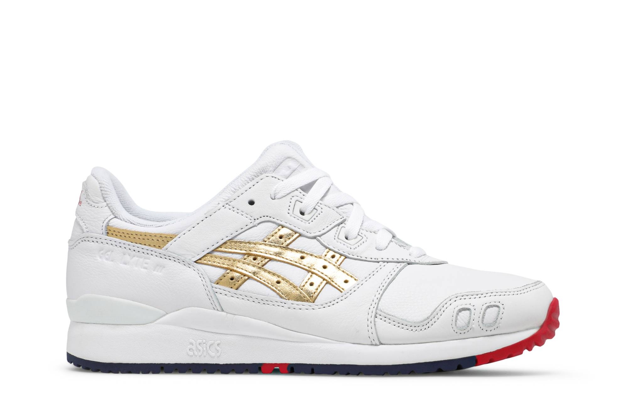 Drawn from the ‘Tokyo Trio Pack,’ the Kith x ASICS Gel Lyte 3 OG ‘Super Gold’ features a celebratory color scheme inspired by the Tokyo Olympic Games. The retro runner carries a premium white leather upper with metallic gold tiger stripes along each of the side panels. ASICS Gel branding adorns the heel in contrasting red and navy lettering, matching the co-branded sockliner and color-blocked rubber outsole. UPPER MATERIAL Leather