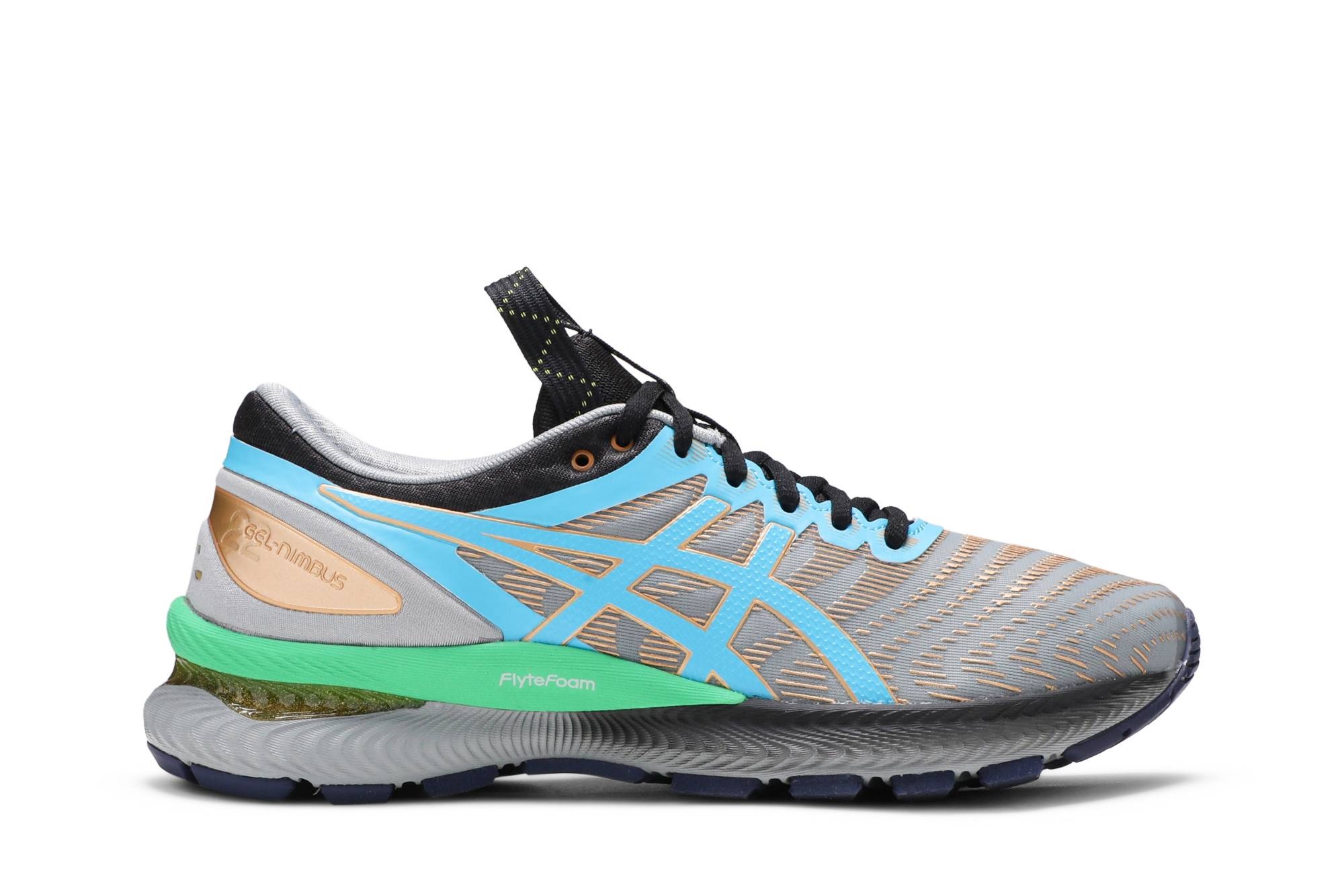 The ASICS women’s FN1-S Gel Nimbus 22 ‘Stone Grey Blue’ feature vibrant accents on a refreshed version of the original Gel Nimbus 22. Bright blue tiger stripes enliven a seamless upper constructed from grey technical mesh with gold undertones. The metallic hue is repeated on the sneaker’s upper eyelets and a molded heel piece marked with Gel Nimbus 22 branding. Lightweight cushioning arrives via a FlyteFoam midsole with ASICS’ Gel technology in the heel. UPPER MATERIAL Mesh