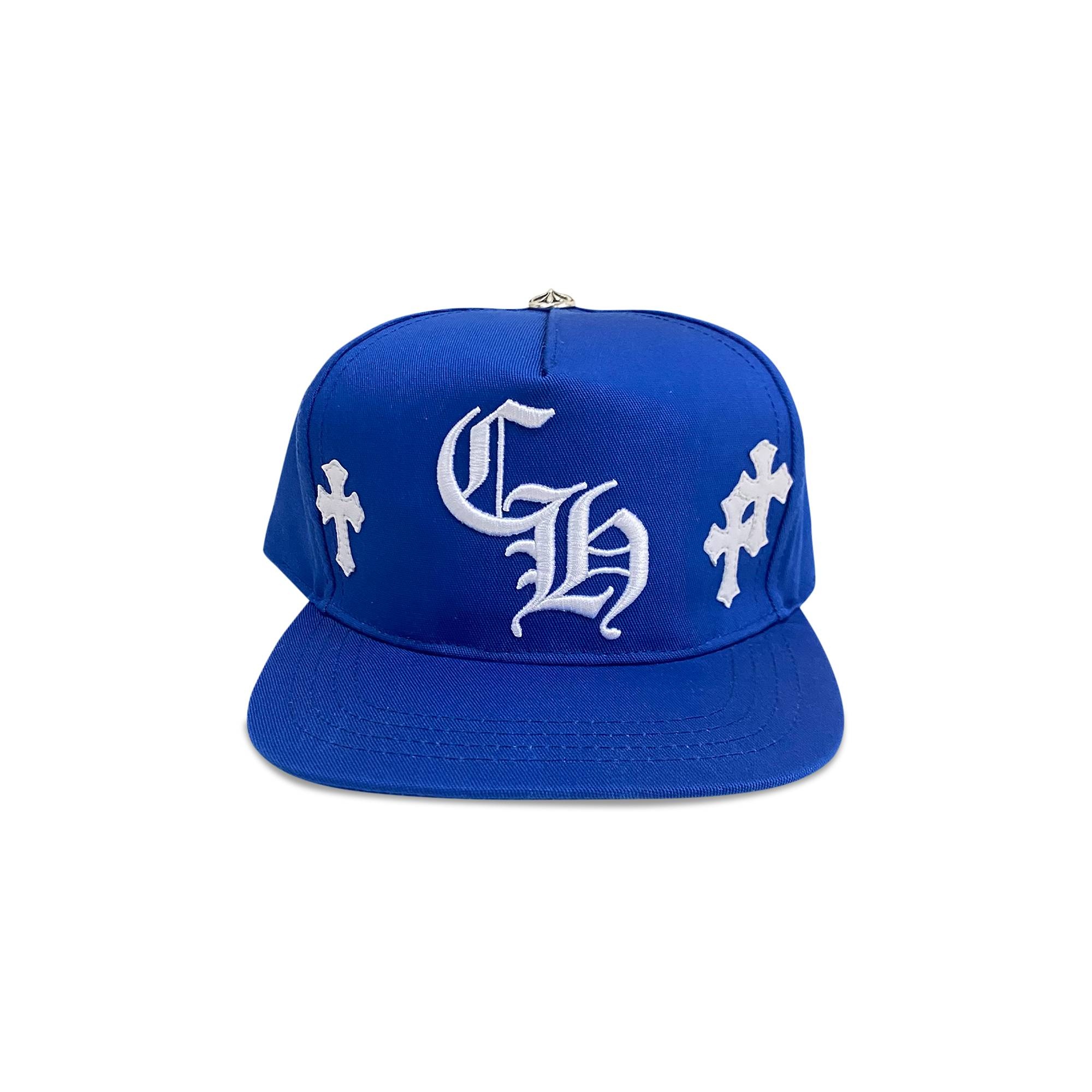 Designed in a bright, blue colorway, this Chrome Hearts Cross Patch Baseball Hat is decorated with signature brand detailing. The letters "CH" are embroidered on the front alongside white, Gothic-style crosses and a silver-tone pin on the top.