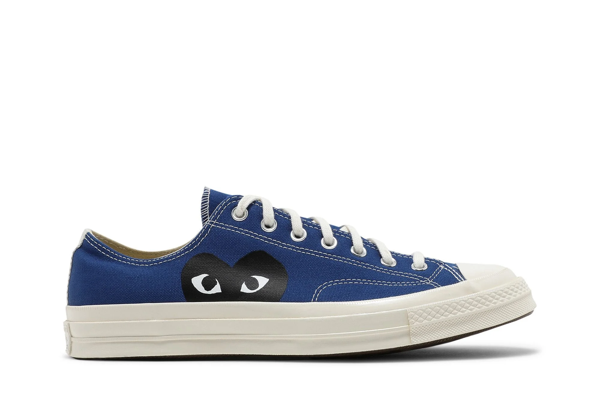 The Comme des Garçons PLAY x Converse Chuck 70 Low ‘Blue Quartz’ updates the canvas sneaker with bold graphics and a vibrant finish. On the lateral side, a cropped, oversized version of Filip Pagowski’s heart and eyes logo stands out in black and white against a brilliant blue backdrop. The low-top rides on off-white rubber midsole with raised sidewalls and a tonal license plate at the heel. Lightweight cushioning arrives via an Ortholite sockliner, stamped with dual Converse and CDG Play branding. UPPER MATERIAL Canvas