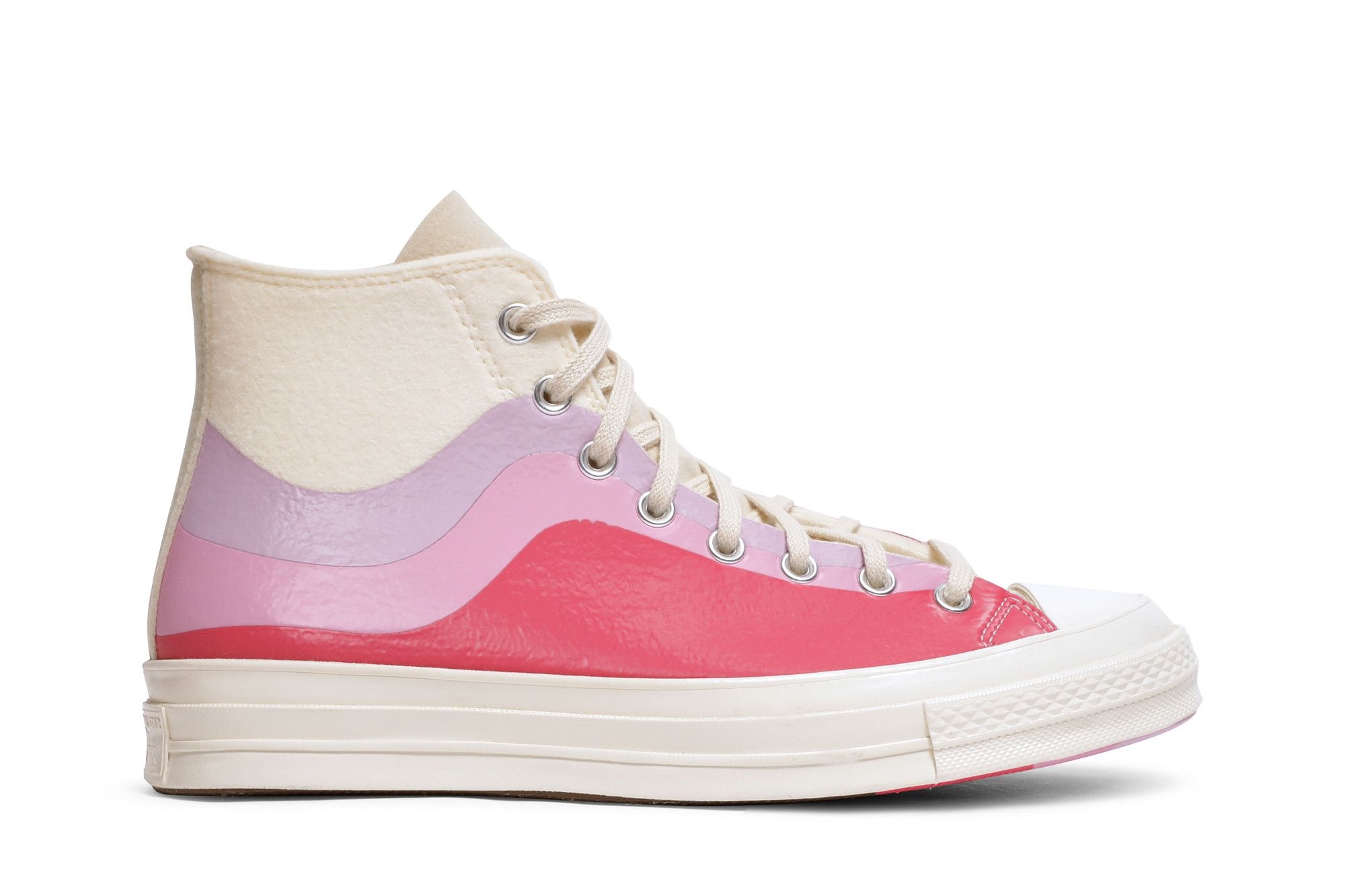 The Converse Chuck 70 High Thermo Felt ‘Winter White Pink’ features a unique design inspired by contoured weather maps during stormy conditions. The upper makes use of soft felt construction in a subtle cream finish, contrasted by cascading synthetic overlays in red, pink and lavender hues. Those same accenting colors are repeated on the standard Chuck 70 rubber outsole, featuring a waffle traction pattern for superior grip. UPPER MATERIAL Textile