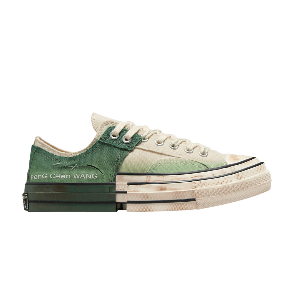 The Feng Chen Wang x Converse Chuck 70 Low 'Myrtle' reunites the creative partners on a low-top edition of the unique two-in-one design. The pre-distressed upper features an off-white canvas build, contrasted by a Myrtle green canvas overlay that wraps around the collar and heel. 'Feng Chen Wang' is inscribed on the lateral heel, while dual branding adorns the sockliner. The color-blocked rubber midsole is updated with stacked, exaggerated foxing and a heavily weathered finish. UPPER MATERIAL Canvas