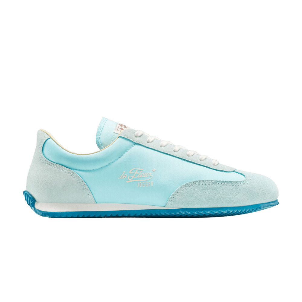 The Golf Le Fleur x Converse Coach Jogger 'Starlight Blue' revives an archival '70s running shoe with a design assist from Tyler, the Creator. The nylon upper is finished in an icy blue shade with tonal suede overlays at the forefoot and heel. Branding elements include a woven Converse tongue tag and 'Le Fleur Jogger' inscribed on the quarter panel. A wedge-shaped foam midsole provides lightweight cushioning. UPPER MATERIAL Suede