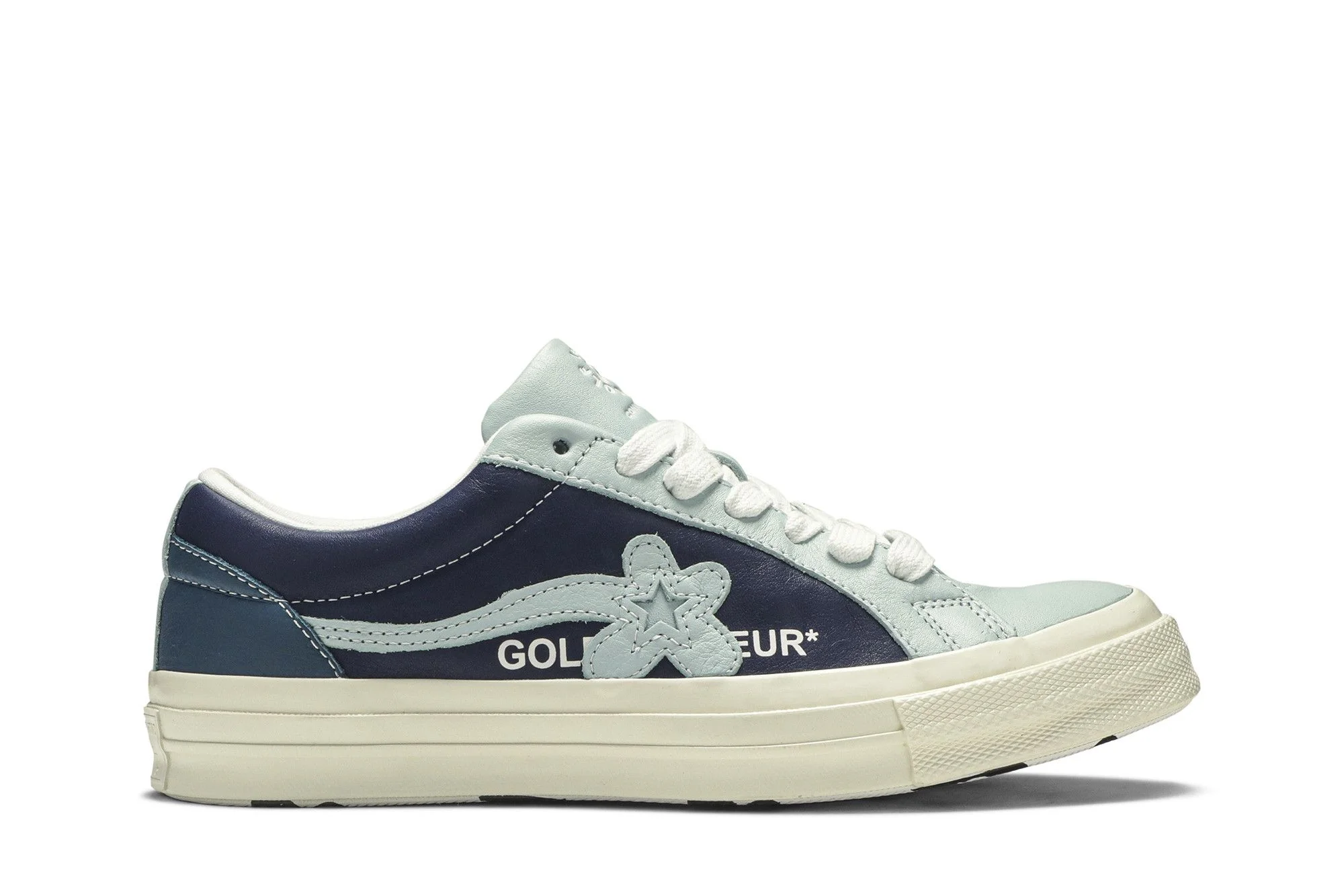 The Golf Le Fleur x One Star Ox 'Industrial Pack - Blue,' is one of two shoes to be released in the February 2019 collaboration between Tyler the Creator and Converse. Doused in leather, the low-top sneaker shows off three panels of Barley Blue, Patriot and Egret to compose the tonal design. A white liner matches cotton laces and a bulky midsole down below while a horizontal flower and star logo is stitched to the midfoot to call out both brands.