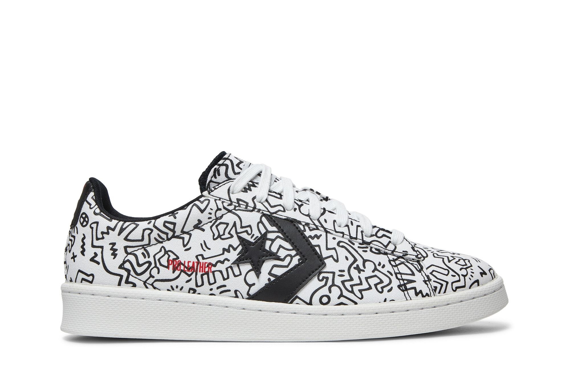 Dropping as part of a capsule collection celebrating the legacy of the pop art icon, the Keith Haring x Converse Pro Leather Low showcases an all-over graphic print made up of the artist’s expressive figures. The graffiti-like designs enliven a white leather upper with traditional Star Chevron branding on the quarter panel. Haring’s signature is printed in red on the contrasting black heel tab. The vintage low-profile silhouette is mounted on a solid white rubber cupsole, featuring a grippy brick-pattern tread underfoot. UPPER MATERIAL Leather