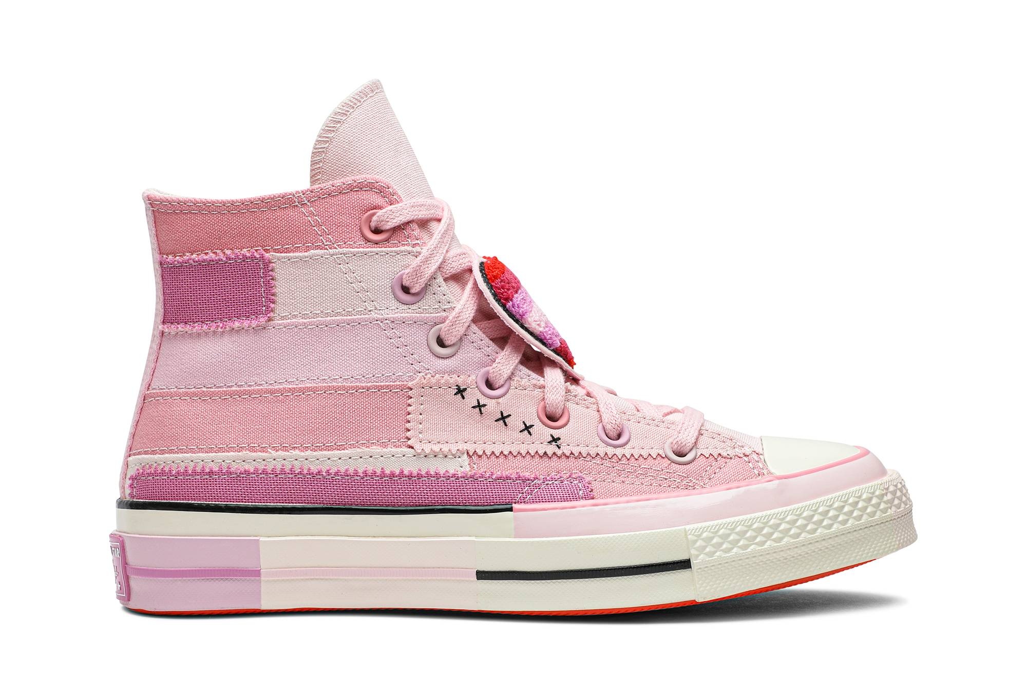Millie Bobby Brown champions self-expression with a limited edition pack of the Converse Wmns Chuck Taylor All Star Hi. Released in November 2019, this women's version gets a patchwork canvas upper in a Petal Pink scheme with tonal eyelets and signature All-Star badges. Interchangeable heart patches are attached to the laces. The sneaker's vulcanized rubber sole features variegated foxing tape and side strips. UPPER MATERIAL Canvas