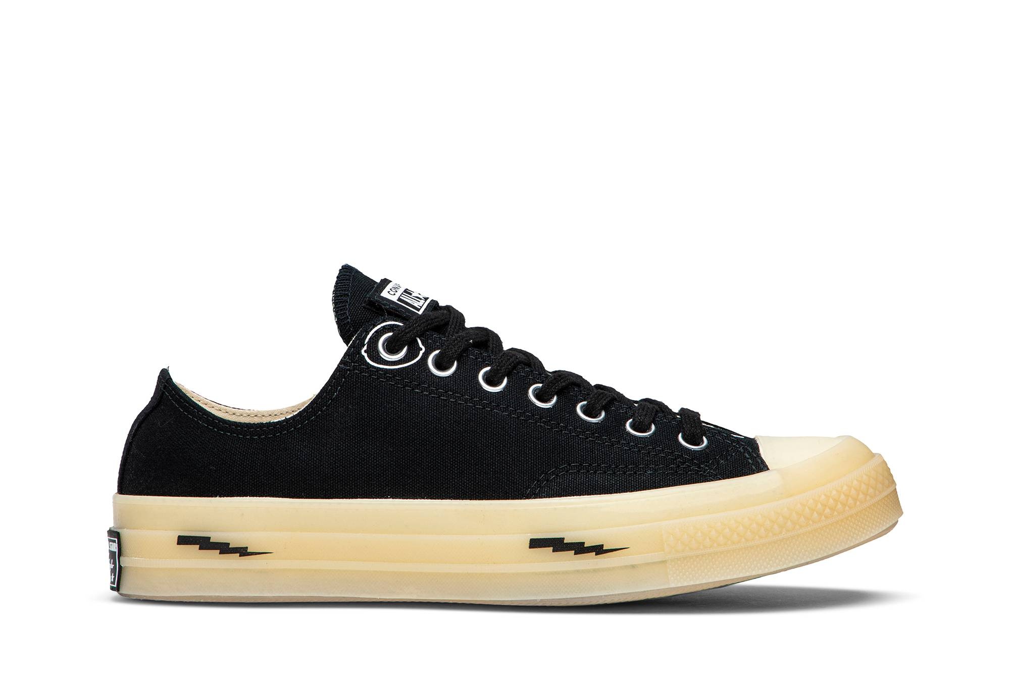 UK brand, Offspring collaborated with Converse to unveil the Offspring x Chuck 70 Low 'Community' in August 2019. The low top sneaker calls upon the OG Chuck 70 Low design, incorporating a breathable, black canvas upper and trademark rubber toe for structure and abrasion resistance. Amping up the look, the laces are printed with 'Converse' branding and lightning bolts, matching the graphic on the cushioned midsole below. A rubber outsole underfoot keeps the grip on varied terrain.