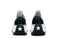 The Converse Run Star Hike Low ‘Black Gum’ features the traditional canvas upper of the iconic Chuck Taylor All Star, complete with chrome eyelets, contrast stitching and a durable white rubber toe cap. The sneaker’s tooling is radically overhauled with a platform midsole and two-piece color-blocked outsole. Black rubber wraps up the heel, while gum rubber extends up the toe, both configured in a sawtooth pattern for optimal grip. UPPER MATERIAL Cavnas