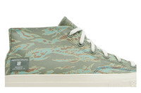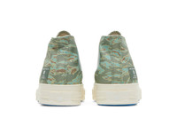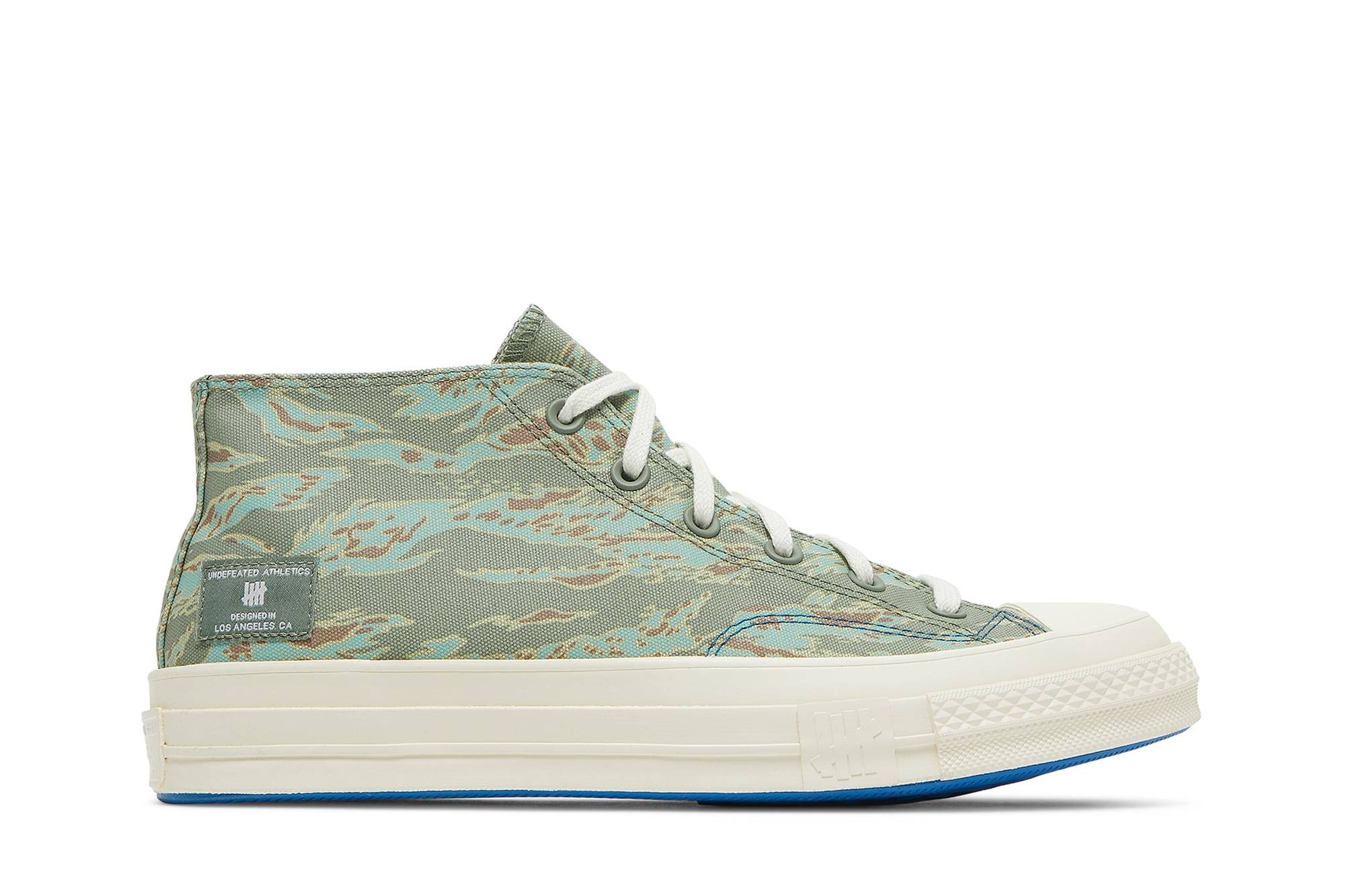 Designed in partnership with the influential LA-based retailer, the Undefeated x Converse Half Chuck 70 Mid ‘Tiger Camo Print’ reworks the sneaker icon into a chukka-inspired silhouette — a first for the Chuck 70 franchise. A tiger-stripe camo print in olive and brown suffuses a 12 oz canvas upper, accented with a mil-spec tag on the lateral heel marked with Undefeated’s Five Strikes logo. The mid-top rests on an off-white rubber midsole, reinforced by a durable rubber outsole in a powder blue finish. UPPER MATERIAL Canvas