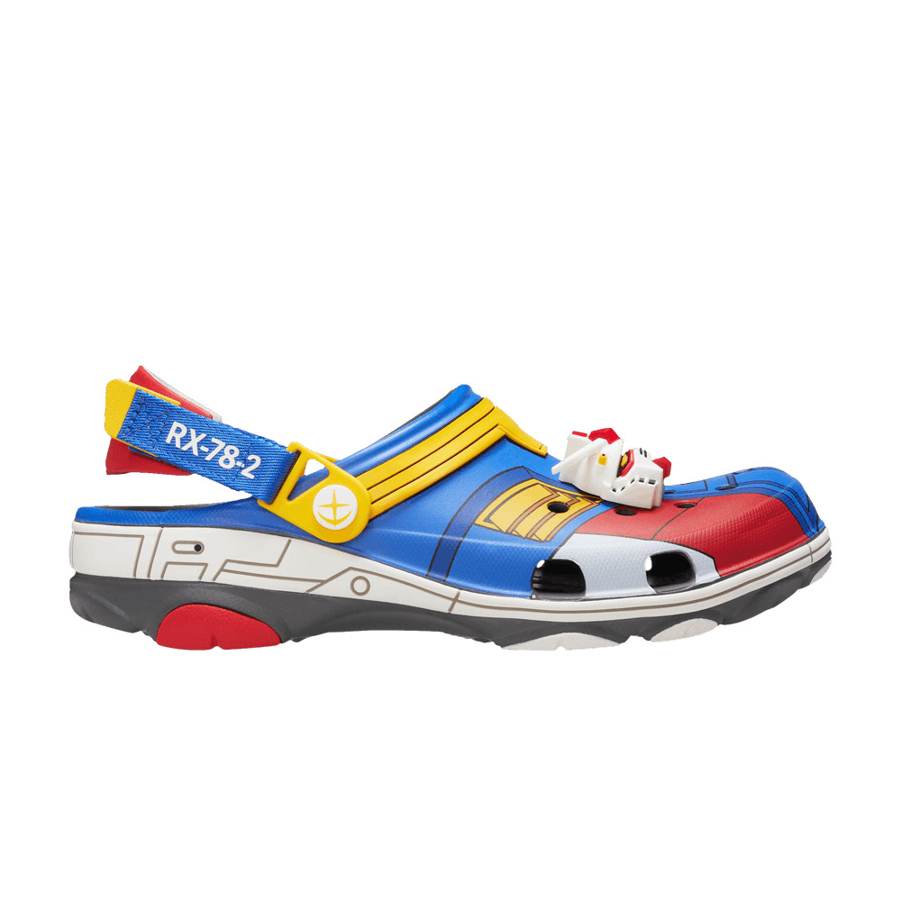 The Gundam x Crocs All-Terrain Clog 'RX-78-2' celebrates the 45th anniversary of the Japanese sci-fi franchise. The lightweight foam build is covered in a multi-color graphic inspired by the RX-78-2 Gundam. Details include breathable ventilation ports and a pivoting heel strap marked with 'RX-78-2' on the lateral side. Underfoot, a lugged outsole provides durable traction on rough terrain. The slip-on can be customized with a set of custom Gundam Jibbitz charms. UPPER MATERIAL Croslite