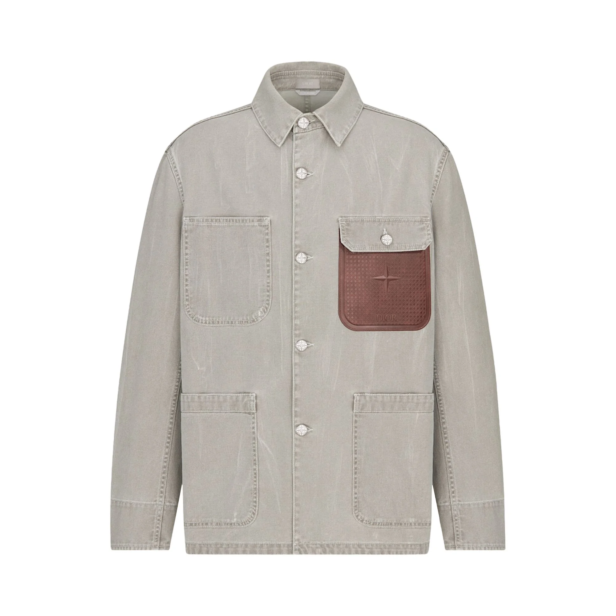 Part of the DIOR AND STONE ISLAND capsule, the jacket showcases the collaboration's signature, highlighting Stone Island's iconic star enhanced by the House signature. Crafted in gray cotton, it has four patch pockets and a leather chest pocket with the DIOR AND STONE ISLAND signature. The wardrobe essential brings a utilitarian touch to an elegantly laid-back style. - Leather chest pocket with DIOR AND STONE ISLAND signature - Patch pockets - Buttoned flap pocket - Button closure - 100% cotton - Made in Italy Size & Fit - Comfortable fit - Back length: 77 cm / 30.5 inches (size 48) - The model measures 189 cm / 74.5 inches and the item shown is in size 48 (FR) - Using our personalized tool will provide you with the best size recommendation - For more information, please review the size guide