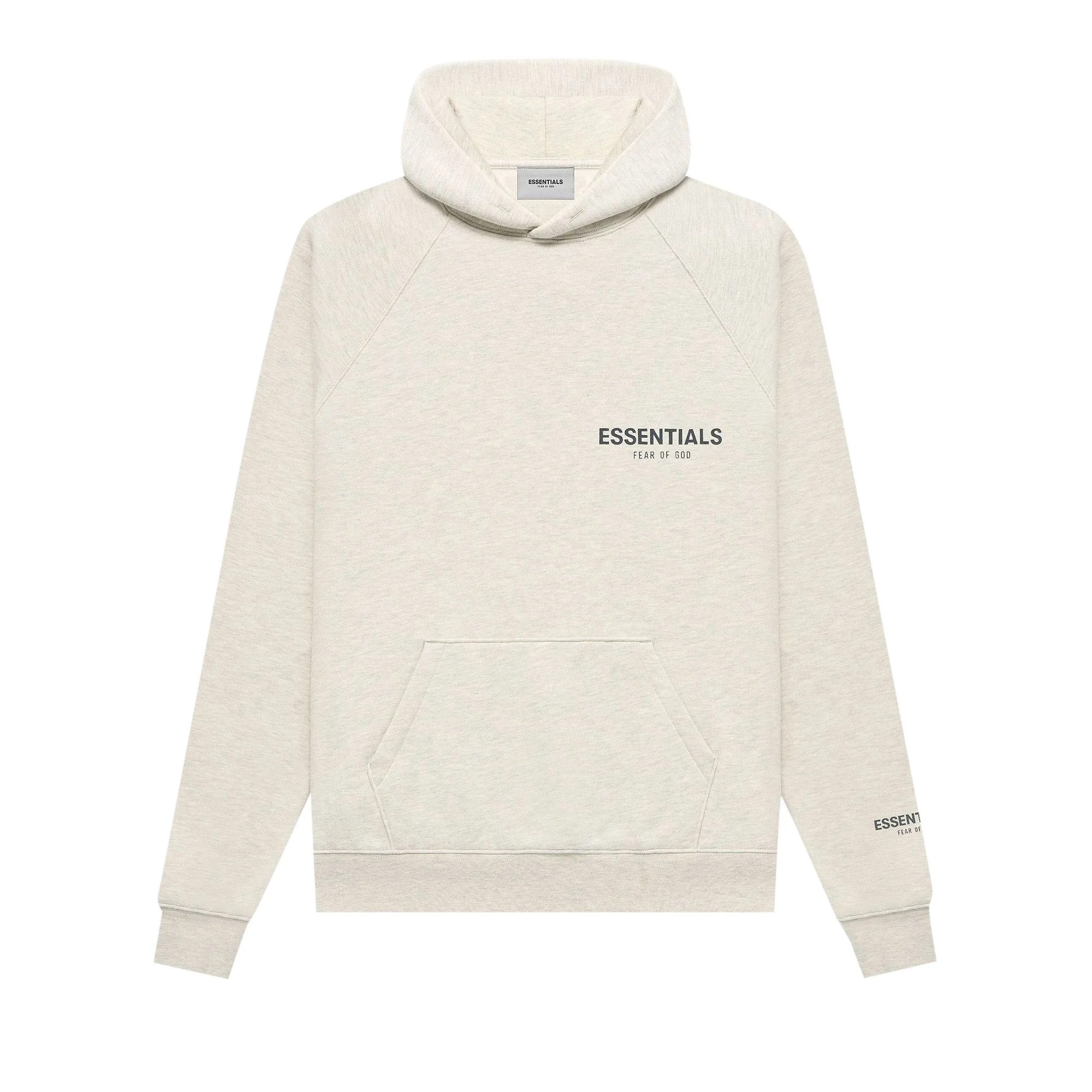 The Fear of God Essentials Pullover Hoodie 'Light Heather Oatmeal' features a fleeceback polycotton build with raglan sleeves, a pouch pocket and ribbed detailing. Subtle "Essentials" branding appears on the chest and sleeve, alongside a rubberized label stitched on the hood.