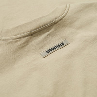From Fear of God Essentials' FW20 collection, the FOG Essentials T-Shirt 'Olive' features a tan hue, with a large "Essentials" logo emblazoned across the chest in black. The wordmark reappears on a small rubberized patch on the back of the neck.