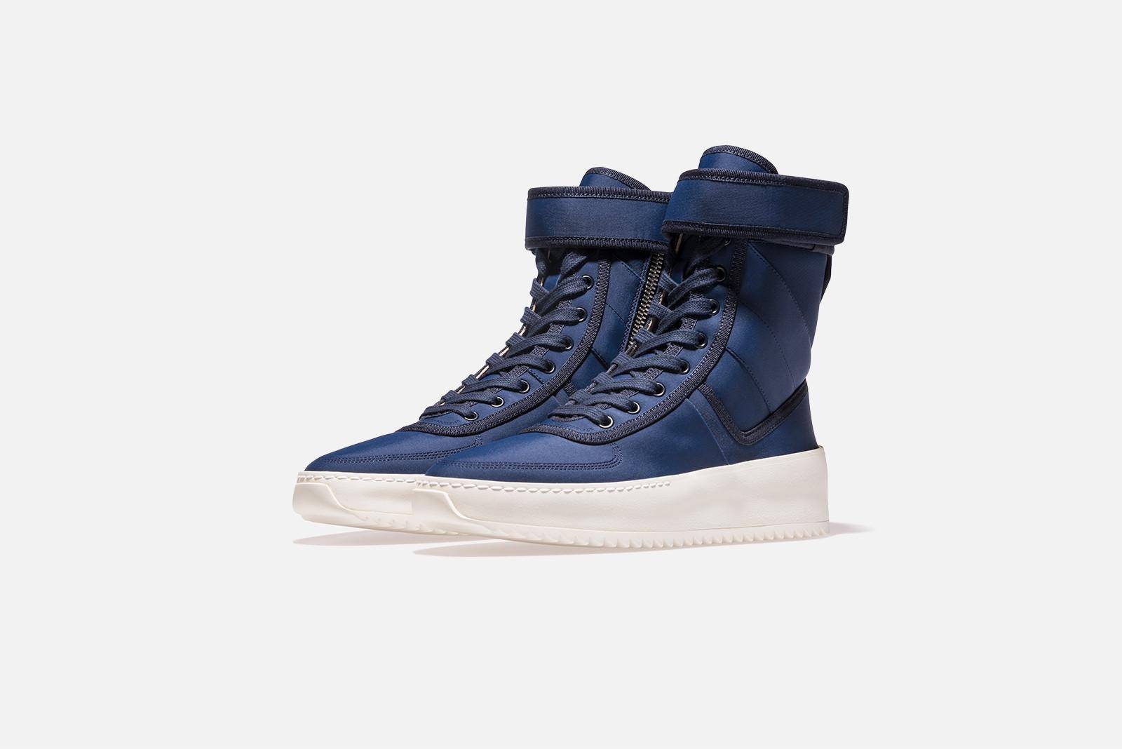 Jerry Lorenzo’s Fear of God collaborated with Ronnie Fieg’s Kith for this ‘New York Blue’ version of Fear of God’s Military Sneaker. Handmade in Italy and limited to just 50 pairs, this version comes with a nylon upper in New York Blue with a detachable Velcro collar strap, metal eyelets and a medial side Swiss Riri zipper. The moody blue tone up top is offset by a crisp white custom-molded rubber midsole with embossed FOG heel branding and a rippled outsole.