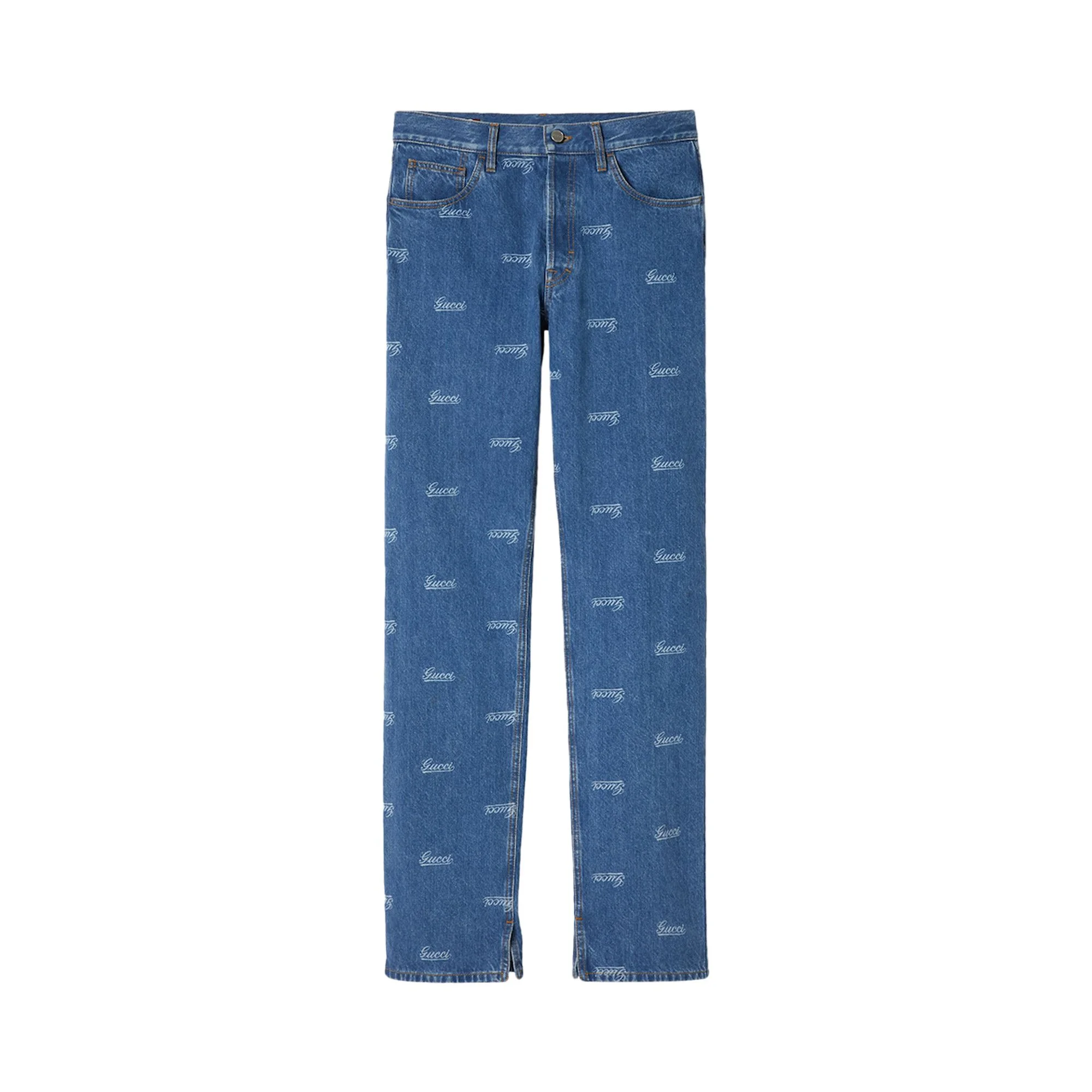 Denim pant with lasered Gucci detail