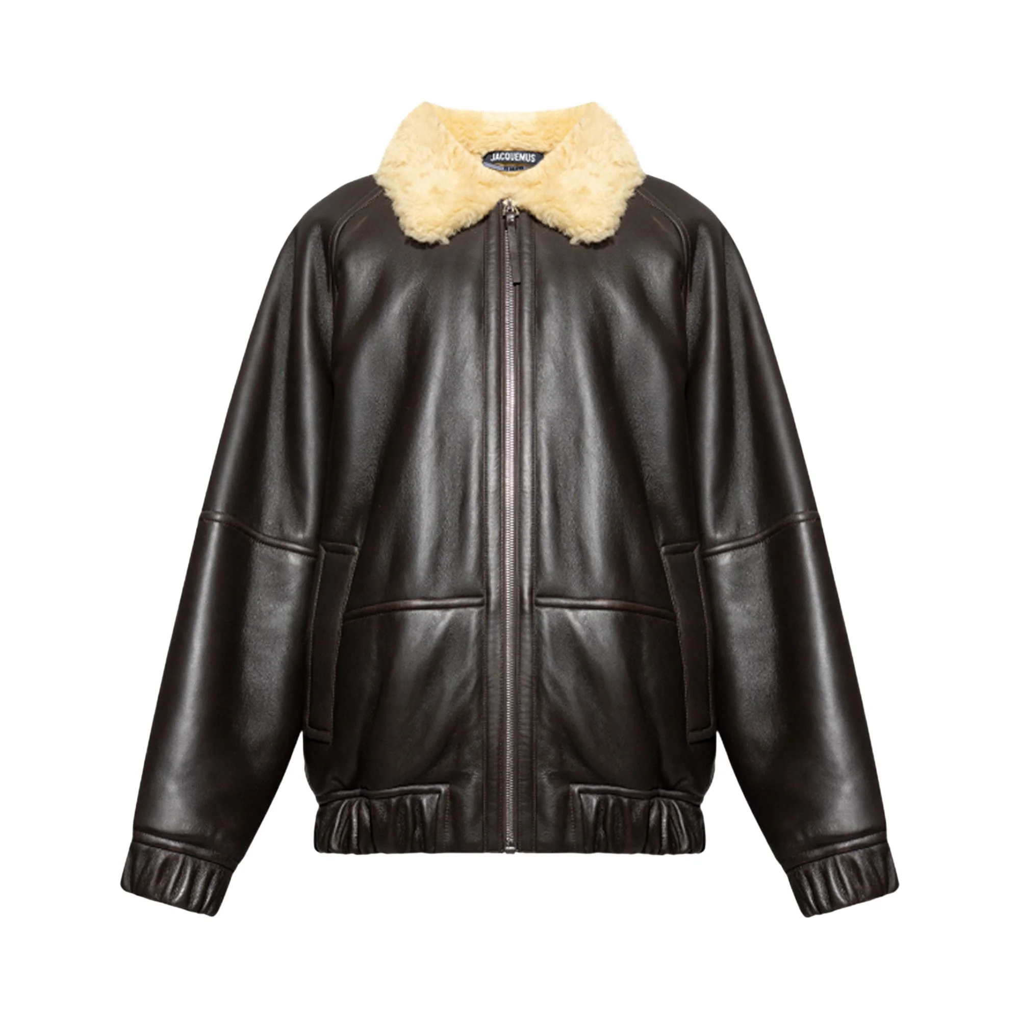 Shearling aviator jacket - Oversized fit - Double-sided lambskin leather shearling - Contrast fur pointed collar - Raglan sleeves with elastic cuffs - Zipped closure with long leather puller - Large welt pockets - Stitched seams - Fitted elastic hem - Embossed logo patch on the back The model is 187cm and wears a size 48 100% Lamb Leather Made in France Ref. OUM00128AC16L05880