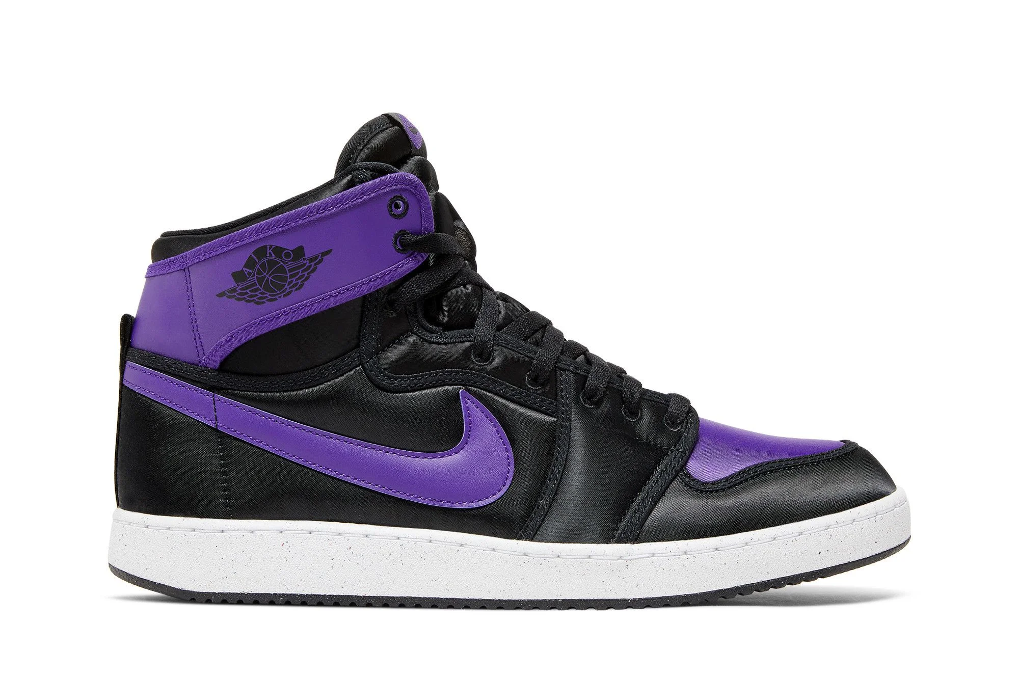 The Air Jordan 1 KO High ‘Black Field Purple’ showcases refreshed materials on a reimagined version of Michael Jordan’s debut signature shoe. In lieu of a traditional canvas build, the upper is constructed from recycled satin, featuring a black base with contrasting hits of violet on the toe box and collar. The latter hue is repeated on the leather Swoosh and woven Nike tongue tag. The high-top is mounted on tooling borrowed from the Nike Vandal, highlighted by white sidewalls and a grippy black rubber outsole. UPPER MATERIAL Satin