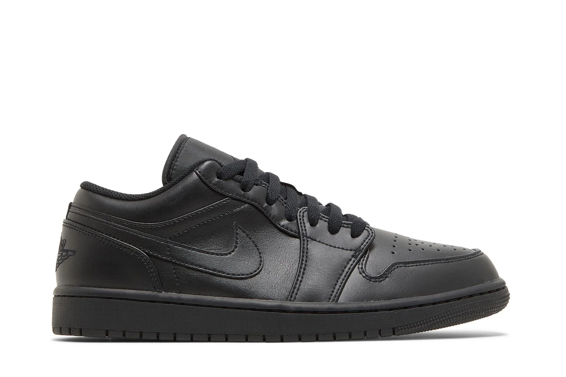 The 2022 edition of the Air Jordan 1 Low ‘Triple Black’ brings back a monochrome colorway of the classic silhouette based on the 1985 original. A stealthy one-note finish is executed on the leather upper, featuring tonal branding elements that include a stitched Wings logo on the heel overlay and a Jumpman icon embroidered on the breathable nylon tongue. The low-top rests on a matching black rubber cupsole, enhanced with an Air-sole heel unit encapsulated in lightweight polyurethane. UPPER MATERIAL Leather