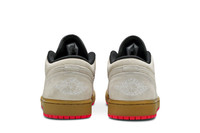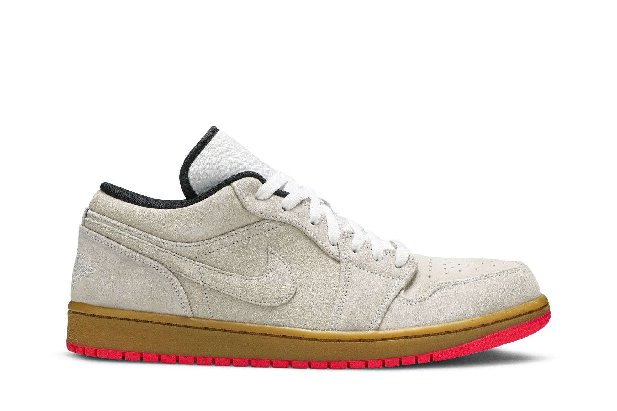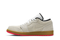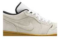 The Nike Air Jordan 1 Low grants the hoops icon a laid-back aesthetic while remaining true to its storied heritage. Surfaced in May 2019, this variation sports a beige suede upper designed with matching side Swooshes and white laces. Jordan branding is embroidered on the contrasting tongue and the Wings logo is stitched across the heel. A Gym Yellow midsole, cushioned by an Air unit under the heel, sits atop a color-pop rubber outsole. UPPER MATERIAL Leather