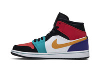 The Air Jordan 1 Mid ‘Multi-Color’ showcases a design that borrows from Nike’s ‘What The’ concept, bringing together clashing hues to accent a classic Chicago-inspired foundation. The latter is readily seen on the toe and collar, both rendered in black and red. A white leather quarter panel, overlaid with an orange leather Swoosh, is flanked by contrasting pops of Turbo Green and purple. UPPER MATERIAL Leather